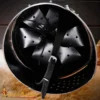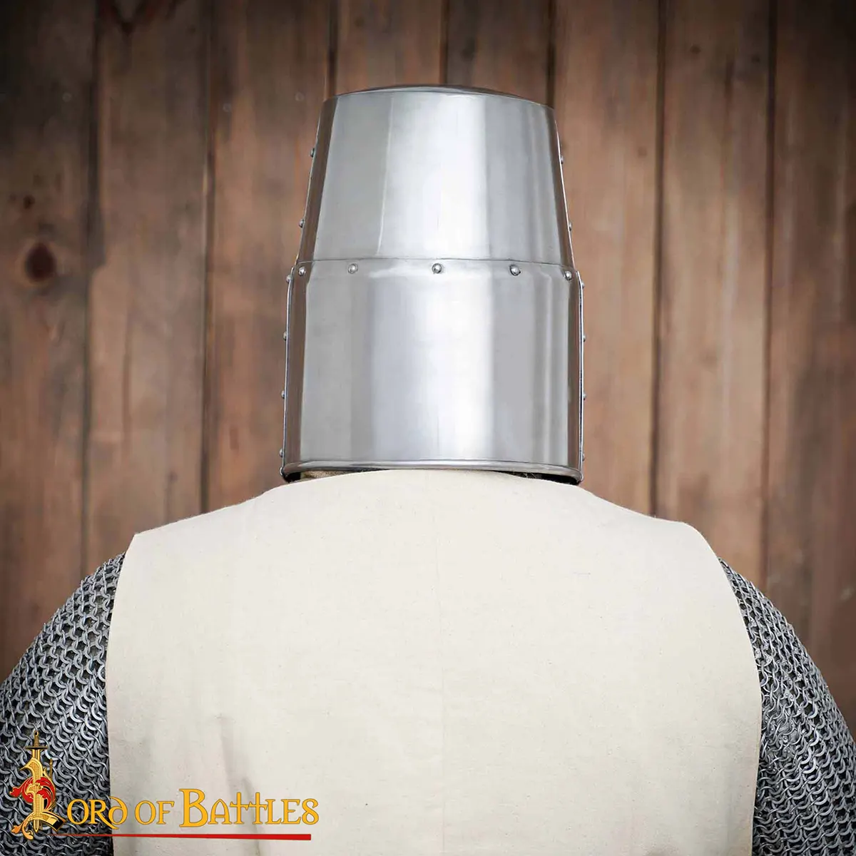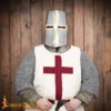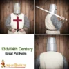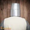 Worn traditionally over a padded arming cap or chainmail coif, the Crusader Great Helmet became a hallmark of knightly armor throughout the Crusades. It was particularly popular among mounted knights for its full-face protection and symbolic power.