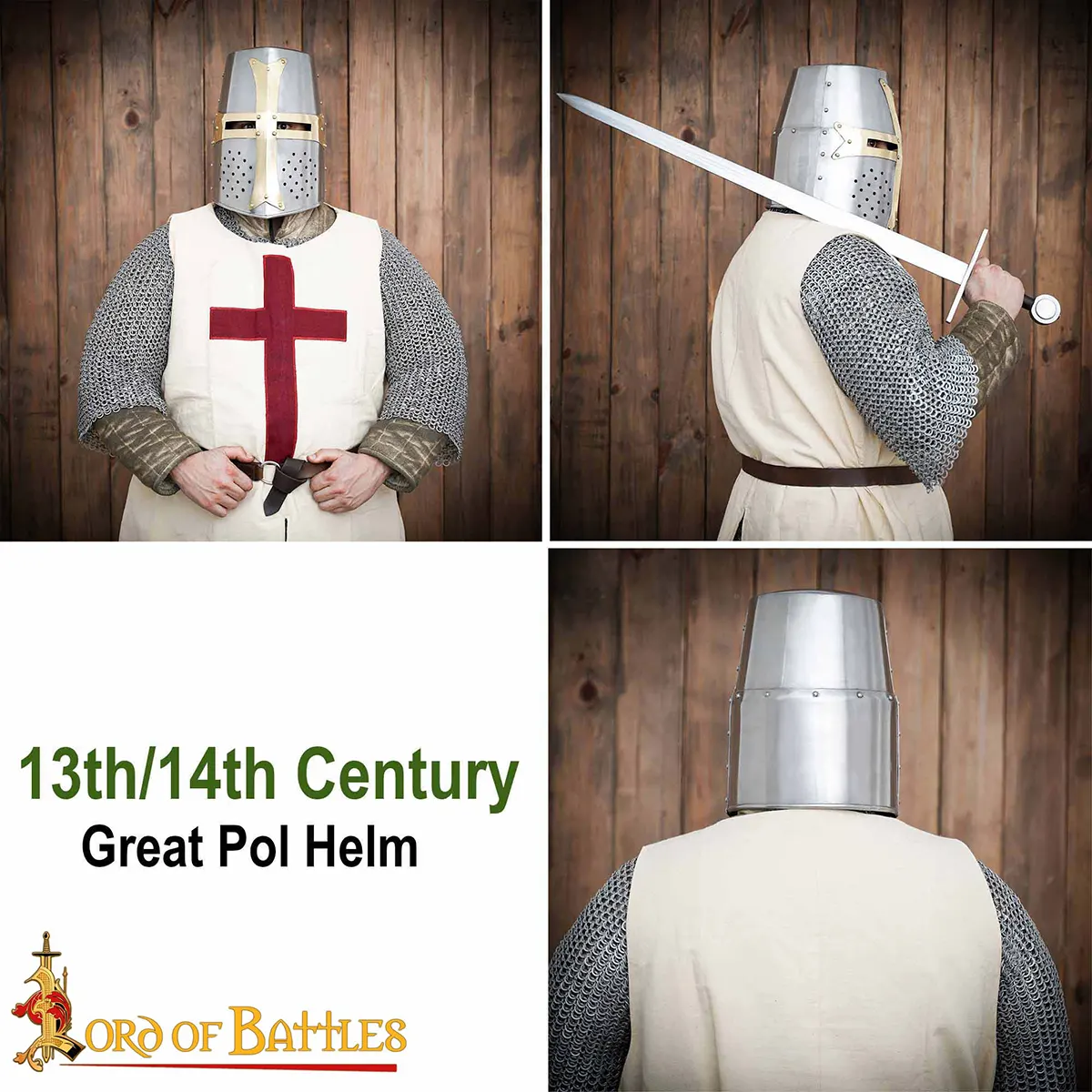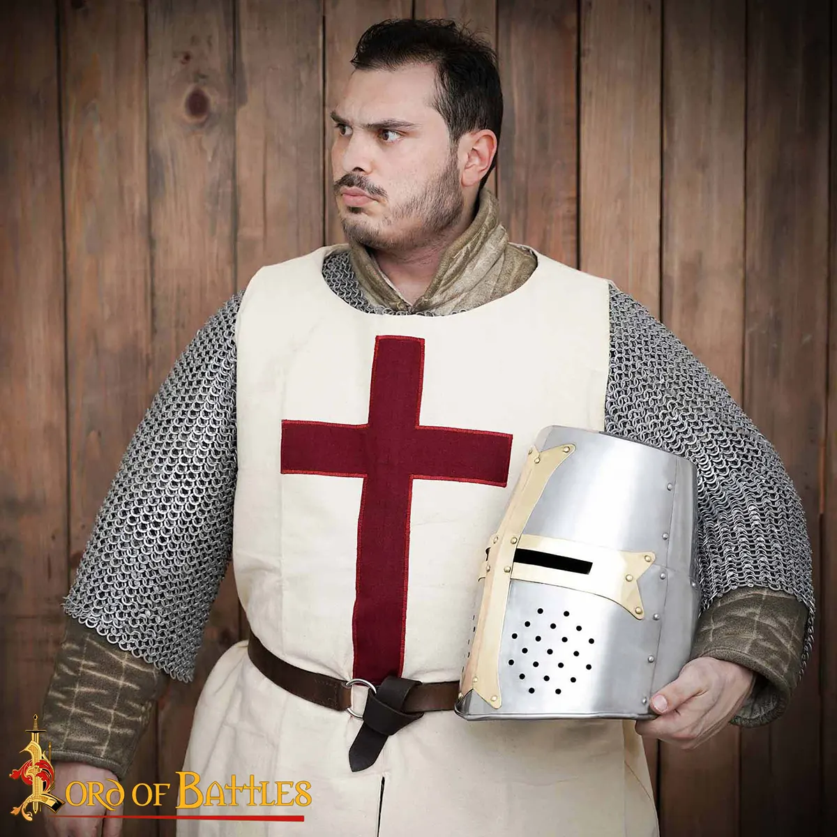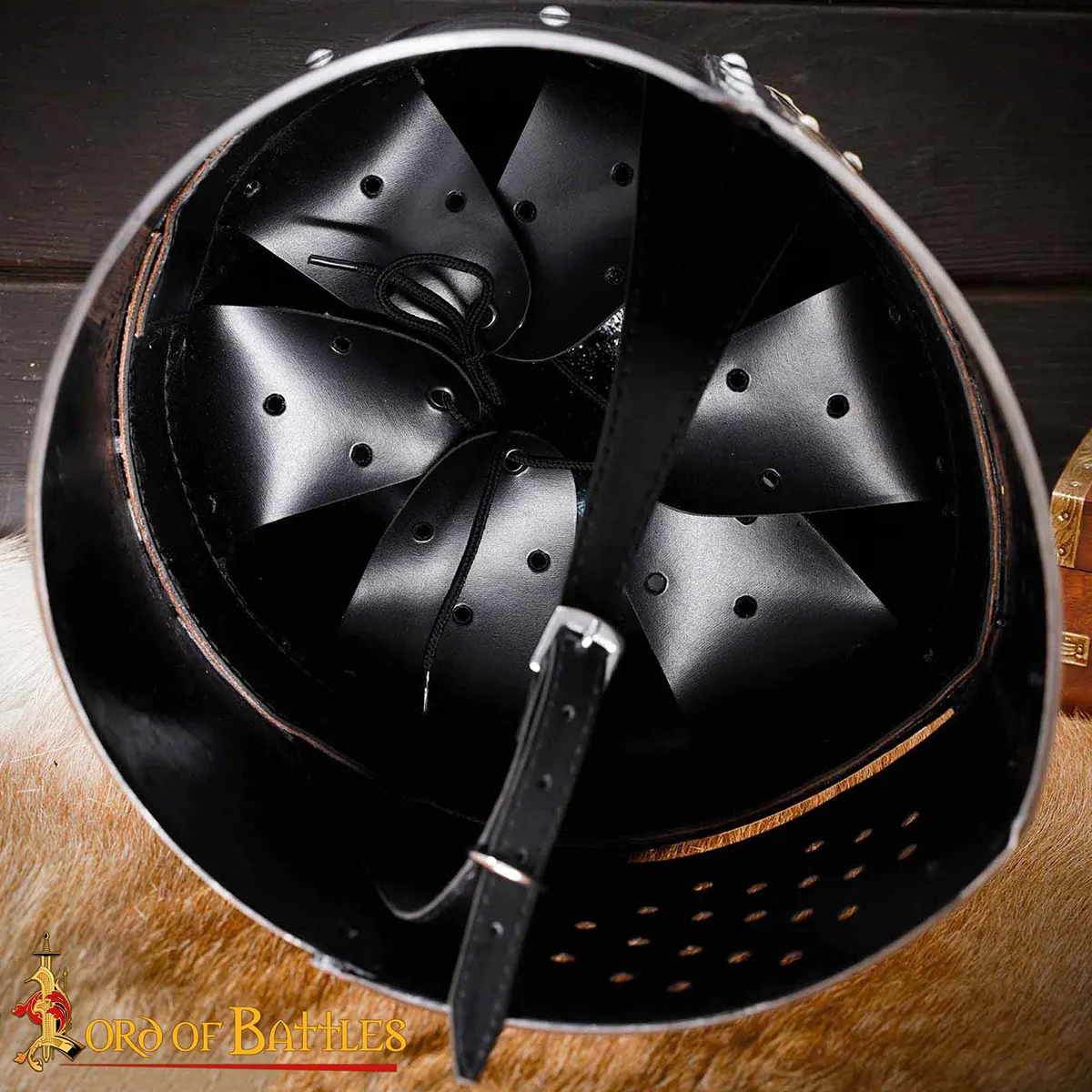 Every Brass Crusader Great Helmet is handmade using traditional methods. Expect minor variations in finish, rivet alignment, and brass tone.