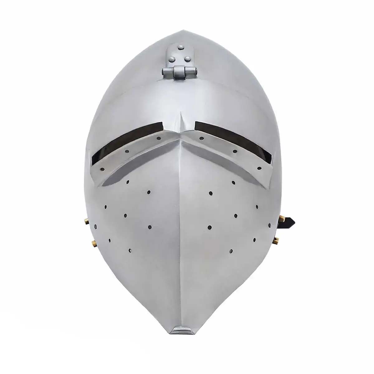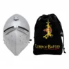 Historical Background: The hounskull bascinet emerged in the later 14th century, especially during conflicts such as the Hundred Years’ War. Knights need better facial protection without sacrificing breathing or vision. The long, pointed visor helped deflect strikes, while the ventilation holes improved airflow.