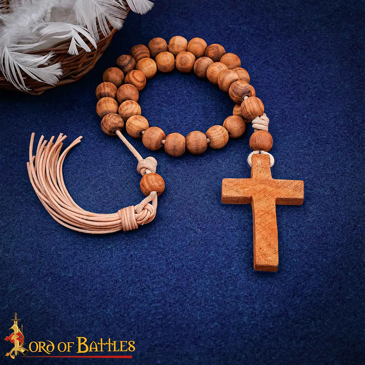 Carry a piece of faith and history with this handcrafted medieval-style rosary, measuring approximately 70 cm in total length. Made with smooth wooden beads strung on a genuine leather cord, it is both durable and authentic. The rosary ends with a finely carved wooden cross and a leather tassel, blending spiritual symbolism with medieval craftsmanship. Each bead carries its own natural wood grain, making every rosary unique.