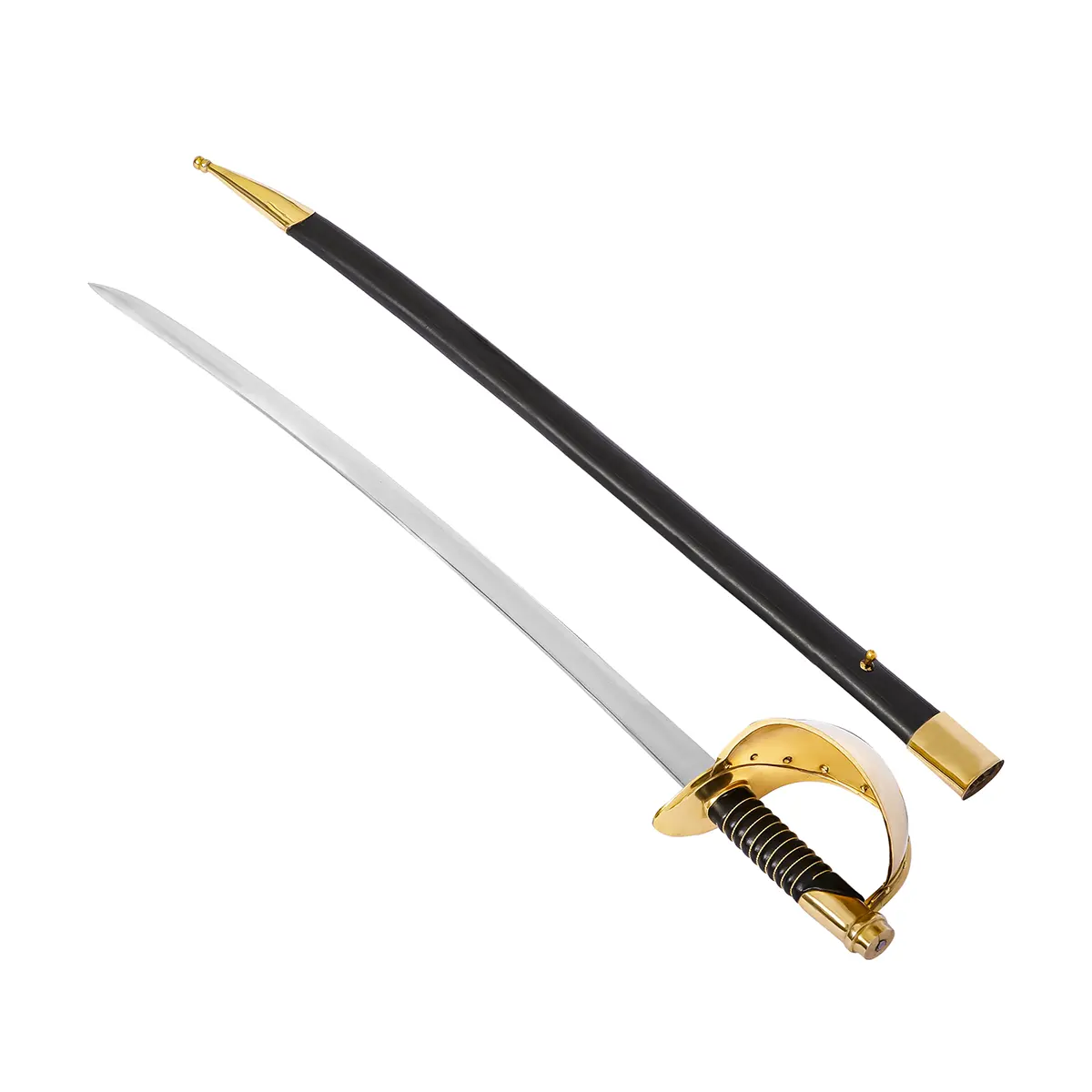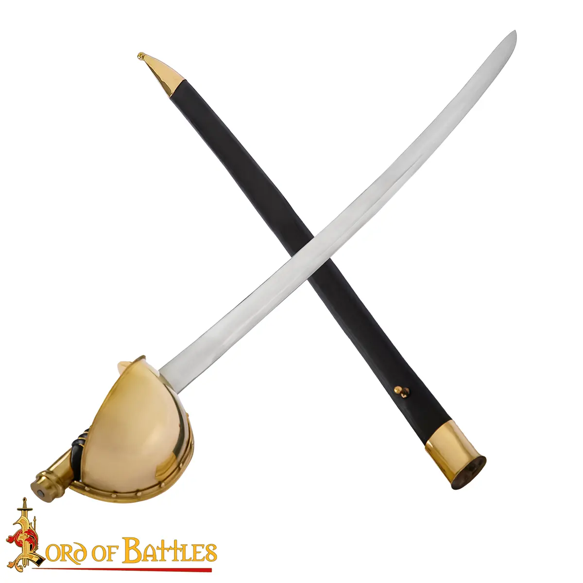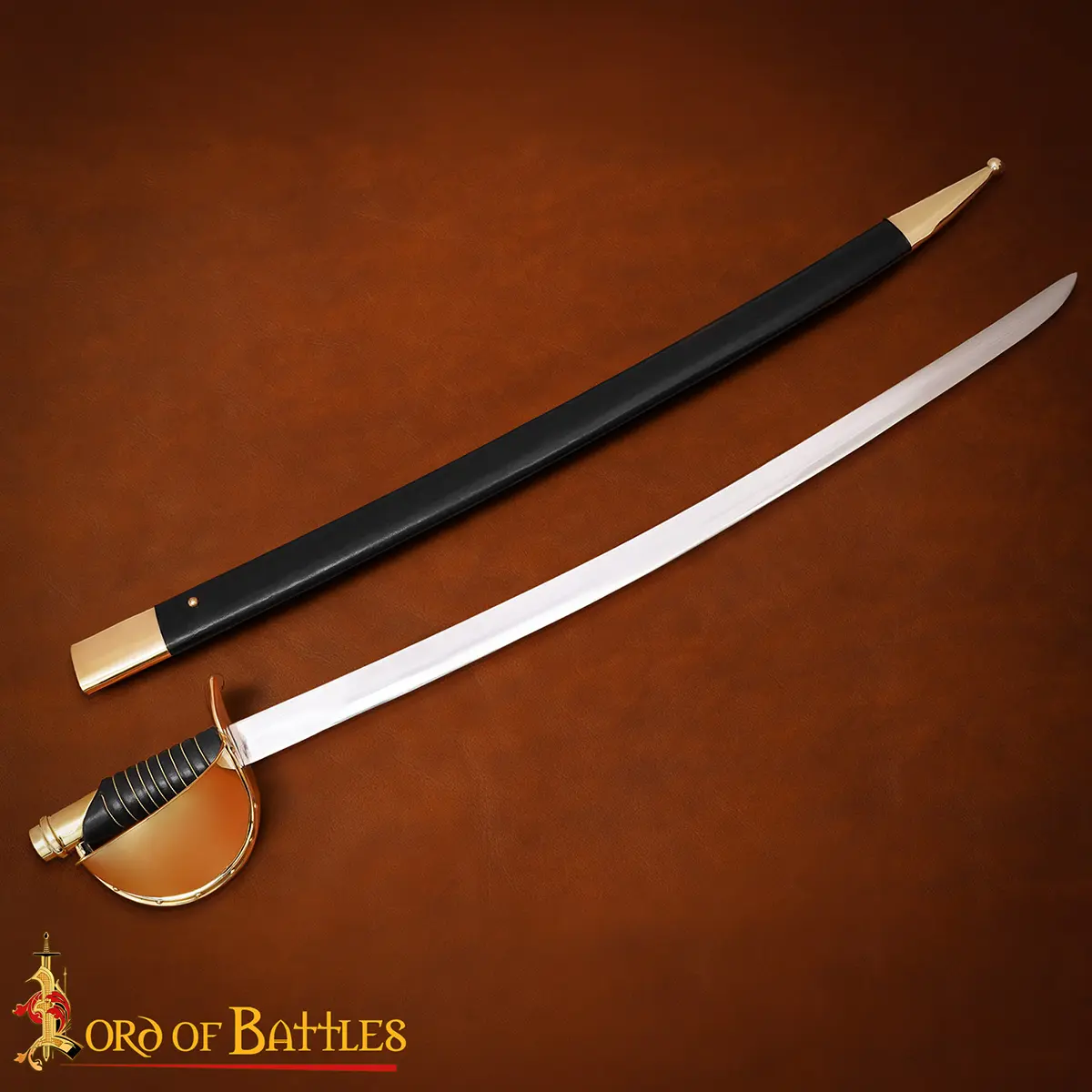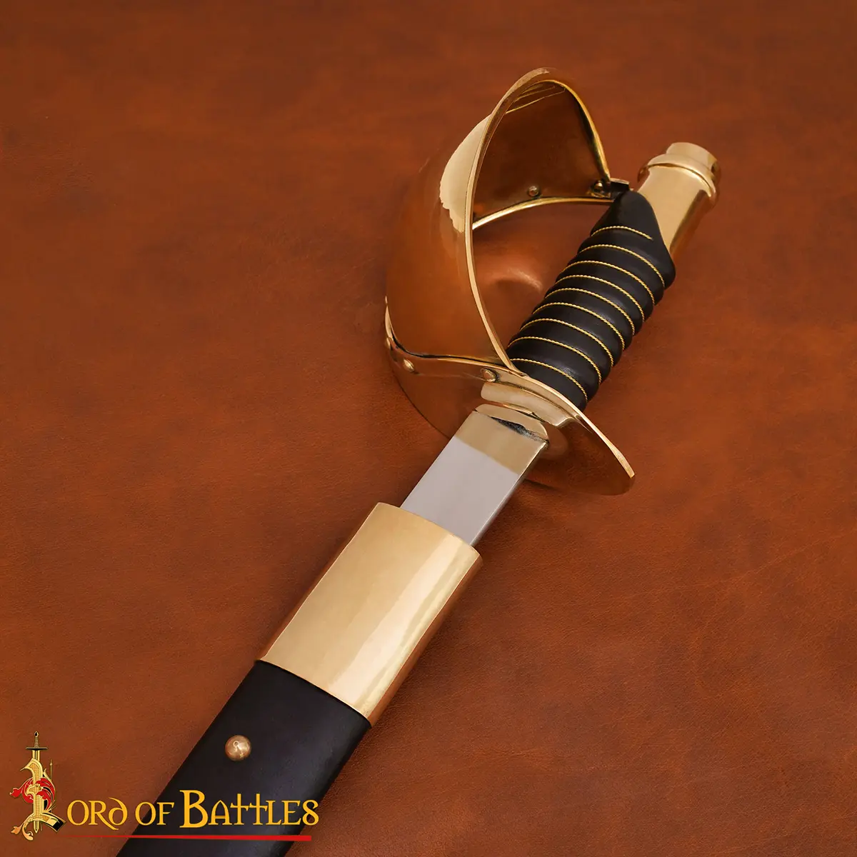 The solid brass D-guard provides robust protection in hand-to-hand encounters, while the real leather-wrapped grip ensures a secure, authentic hold. Its black leather scabbard, finished with antique brass details at the throat and chape, adds maritime character and completes its period look.
