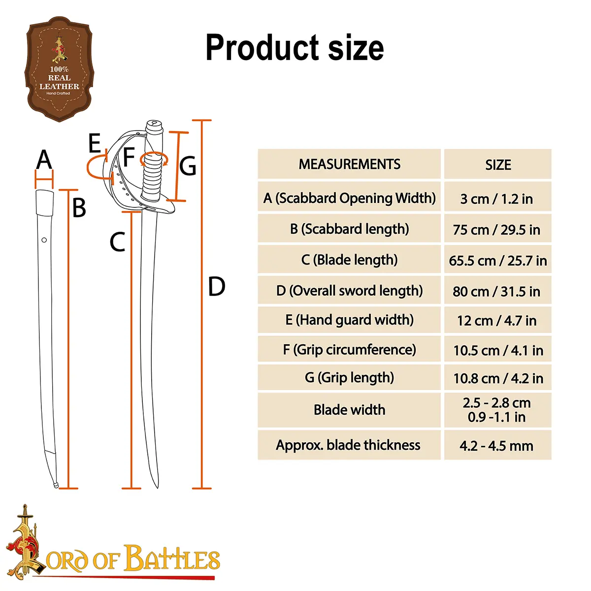 • Overall Sword Length (D): 80 cm / 31.5 in