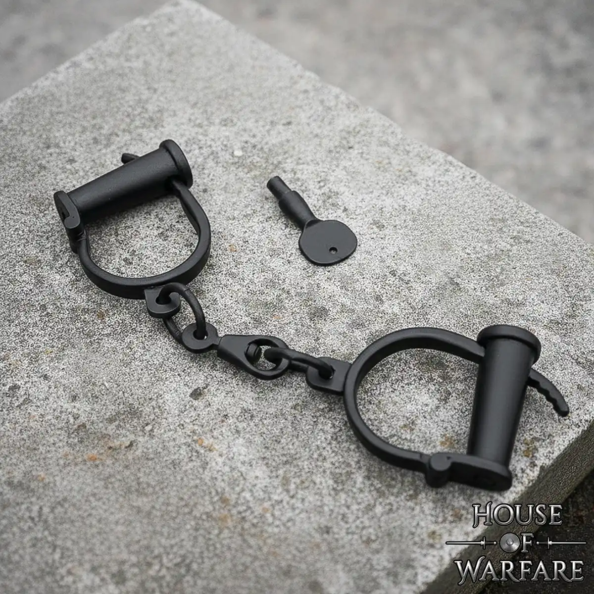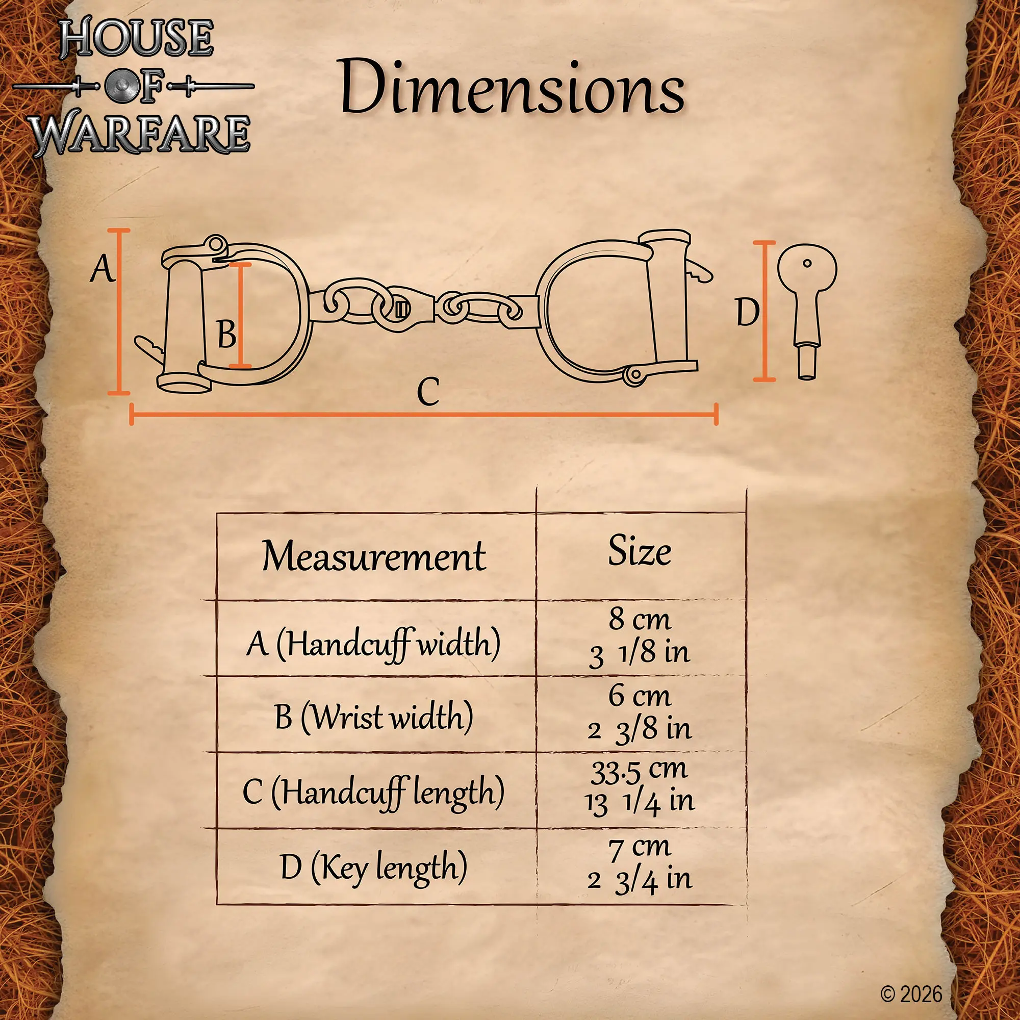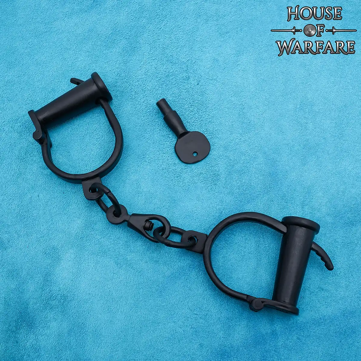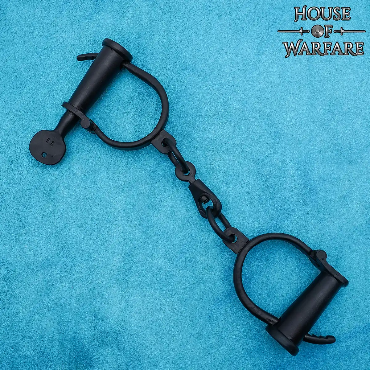 The handcuffs have a rotary key locking system, where the key must be turned in a rotating motion to lock and unlock the cuffs. One sturdy key operates both cuffs, just like the traditional medieval restraint methods.