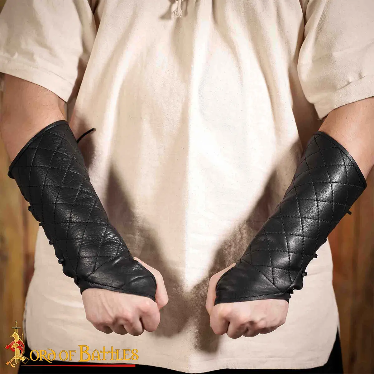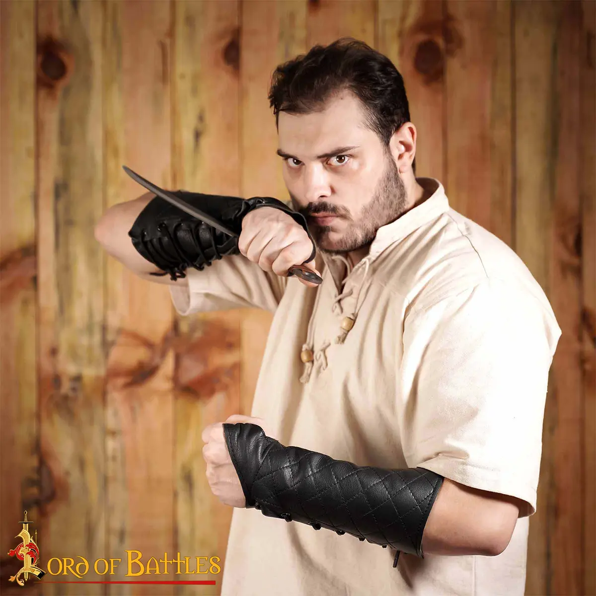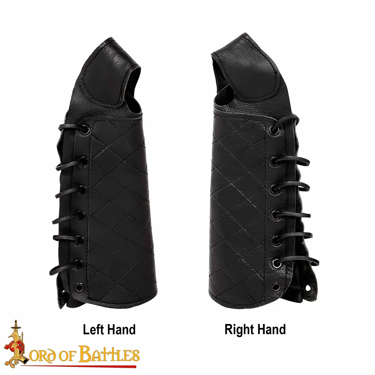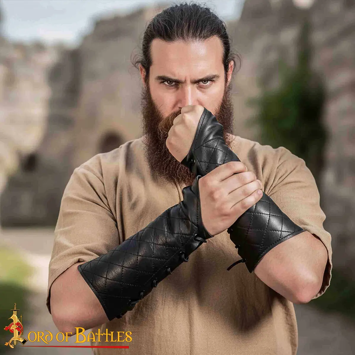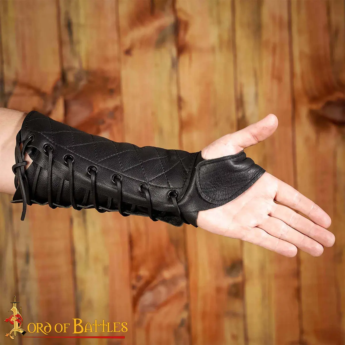 This Archery Bracer is made to protect the forearm and thumb during archery while giving an authentic medieval look. Made from 100% genuine leather, it has a quilted pattern with durable crafting for strength, flexibility, and long-lasting use. The integrated thumb guard helps reduce string impact, making shooting more comfortable and controlled.