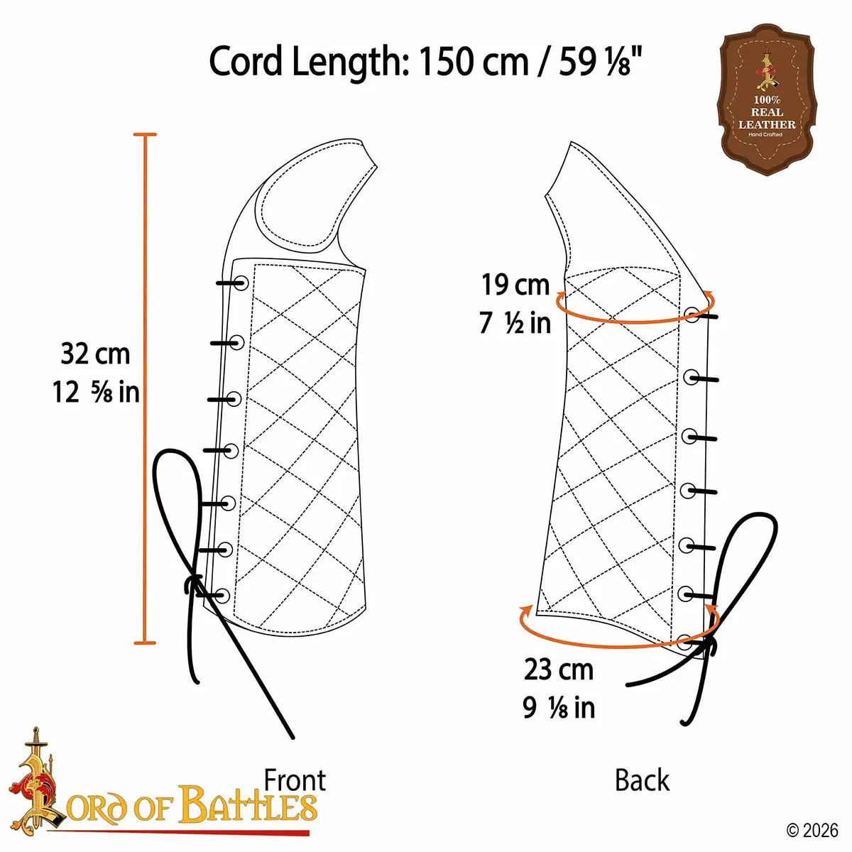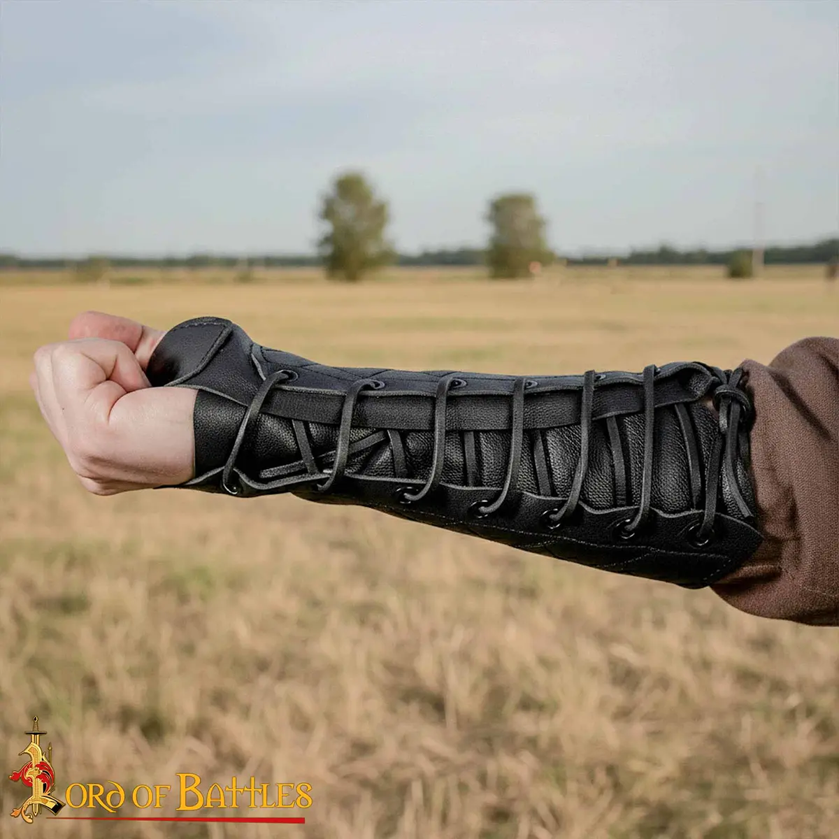 The lace-up fastening system allows the fit to be adjusted easily, ensuring stability during extended wear. Whether used as a Leather Archery Bracer for archery practice, worn as a medieval leather bracer for LARP or training, or as a medieval arm bracer for costumes and stage use, it delivers both function and visual authenticity.