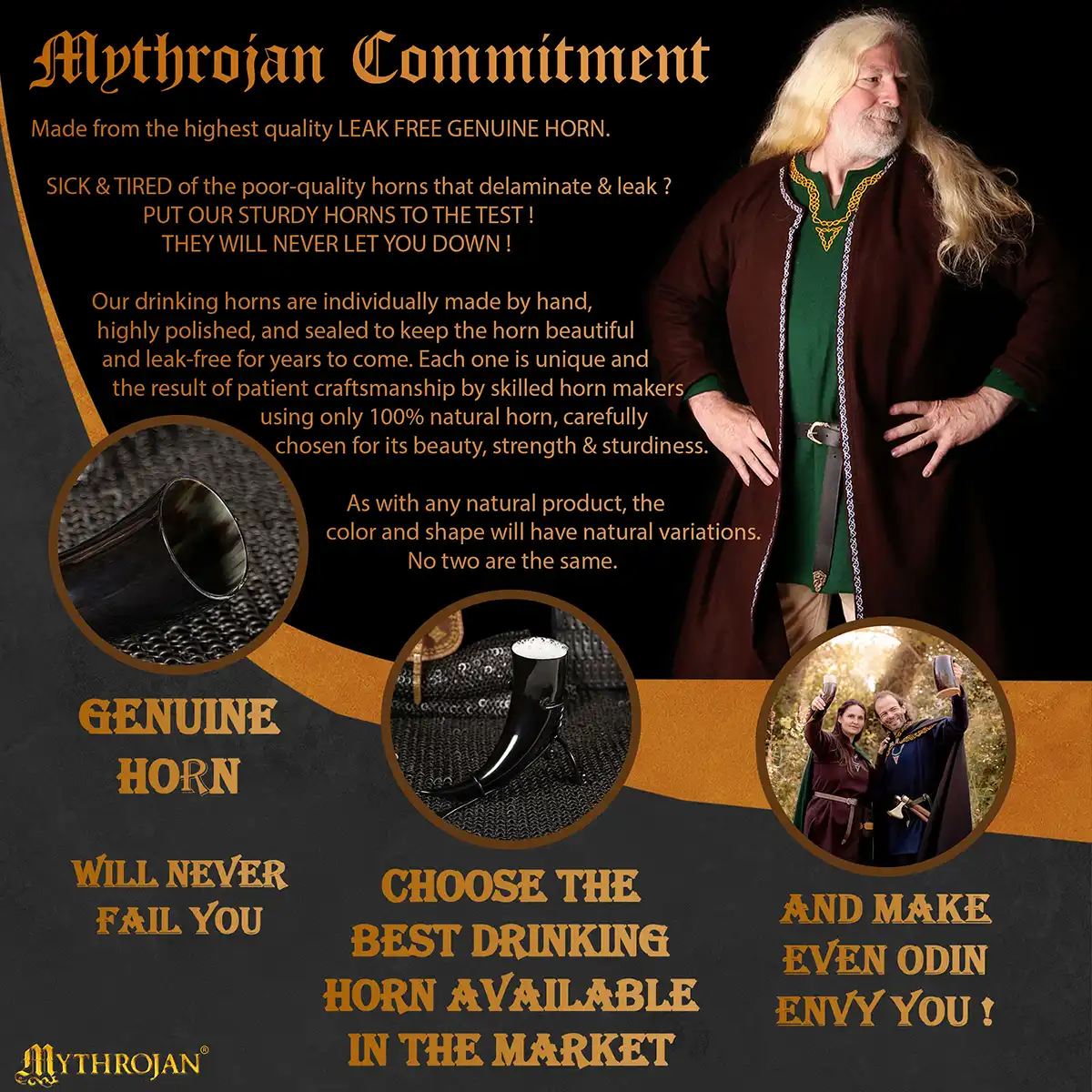Each Authentic Viking Drinking Horn is handcrafted from natural material, so variations in shape, size, and color are natural and part of its unique character.