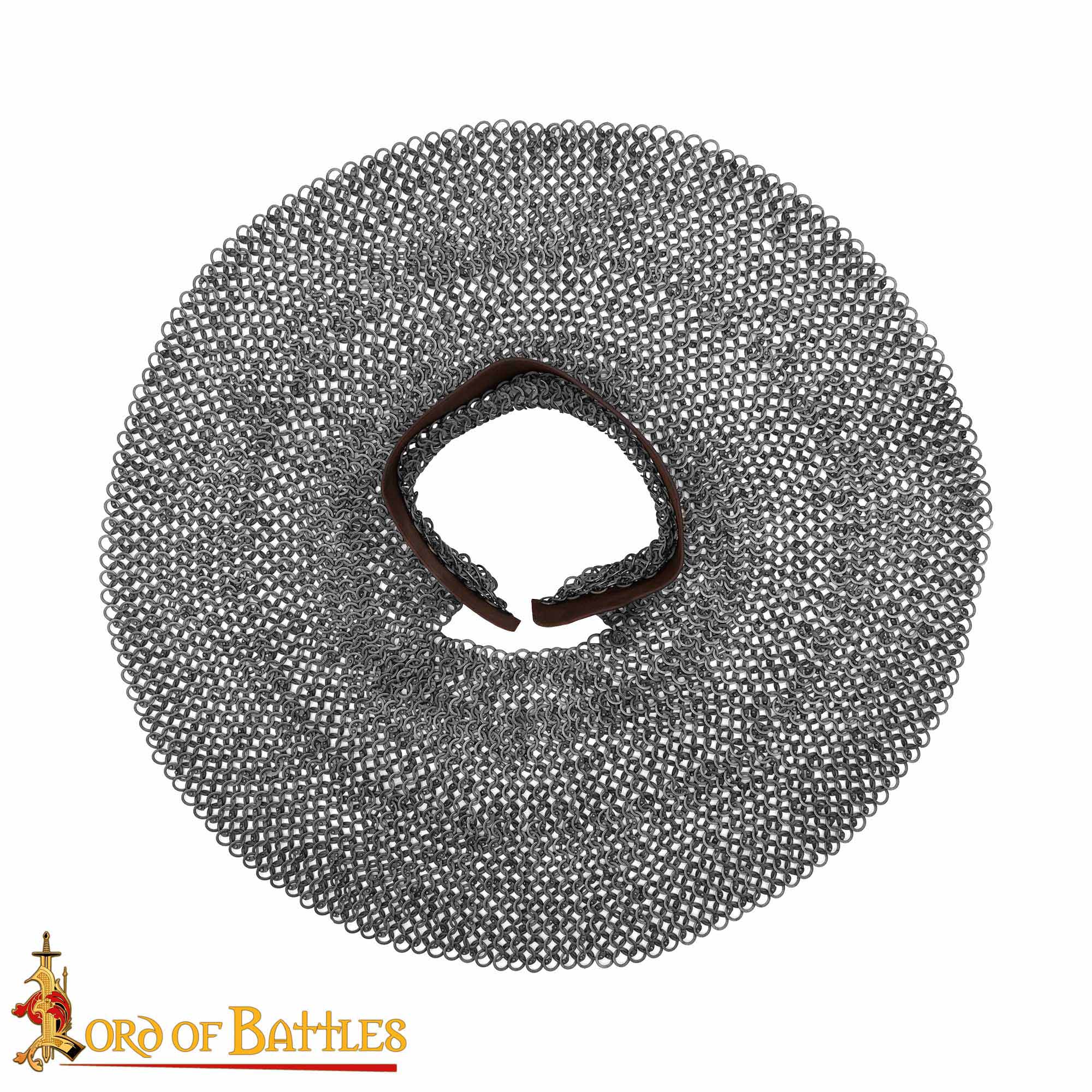Enhance your medieval helmet with this historically inspired chainmail aventail, crafted from flat 9mm mild steel rings and round rivets for robust protection. The alternating construction of riveted and solid rings offers both authenticity and functional resilience, closely mimicking historical mail patterns from the 13th to 15th centuries.