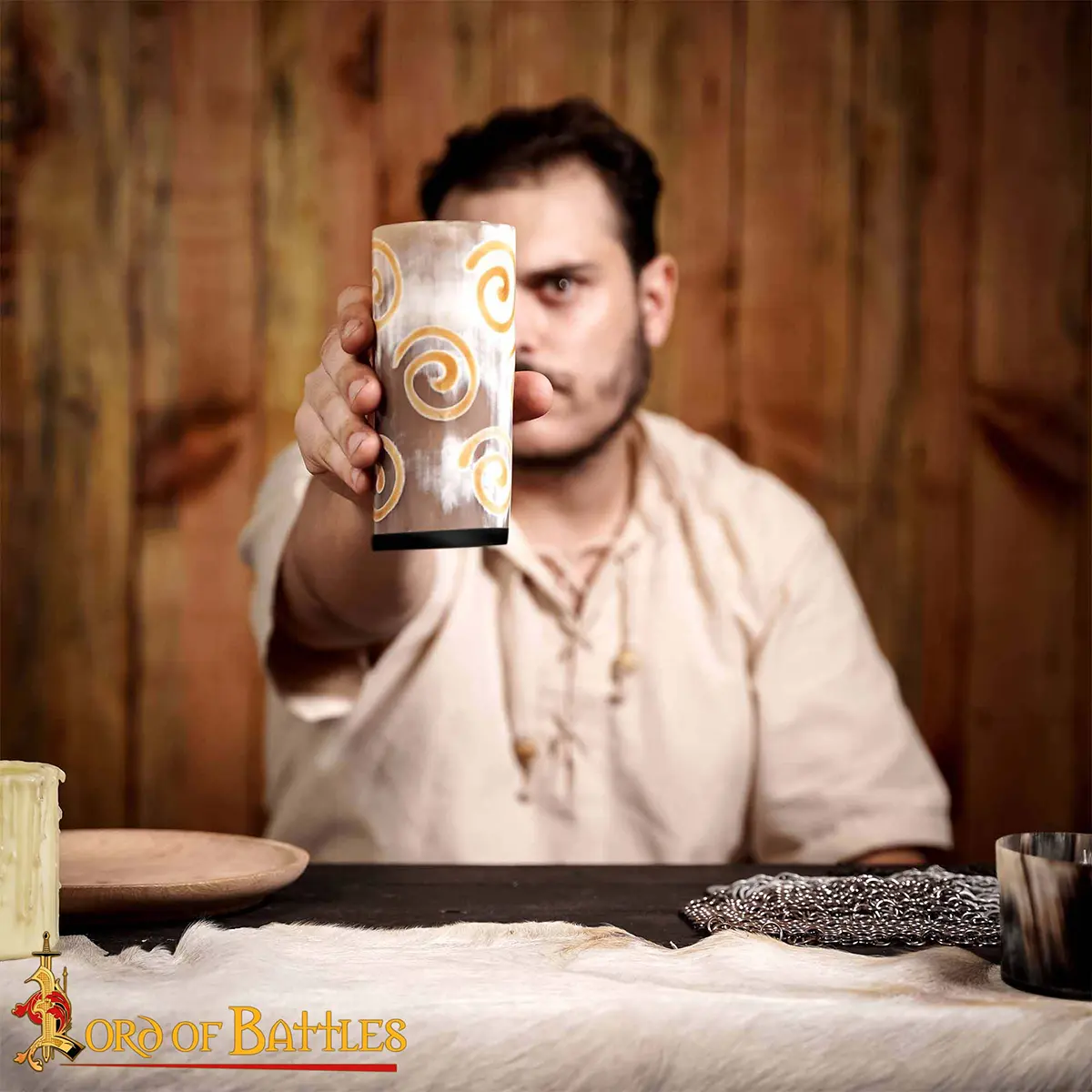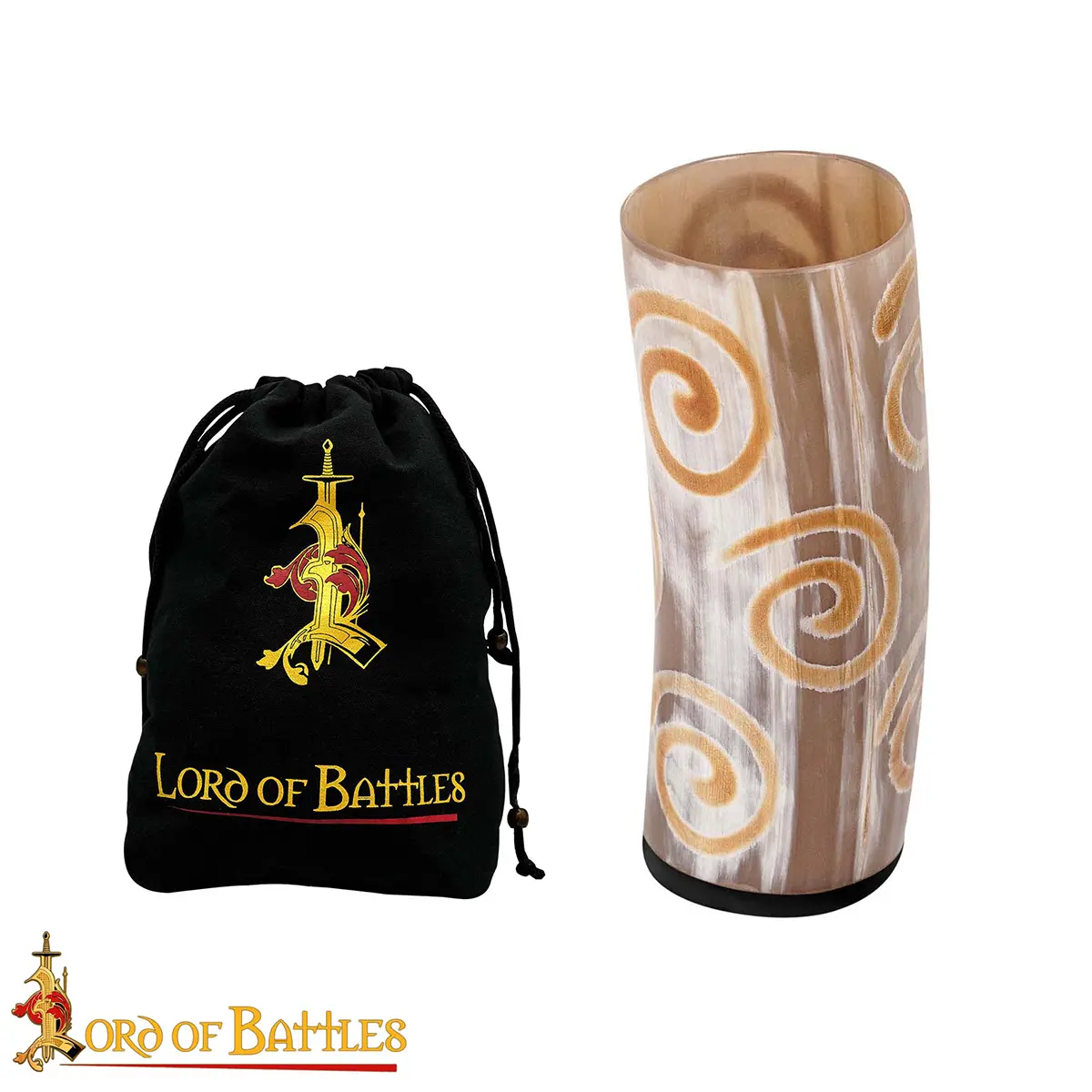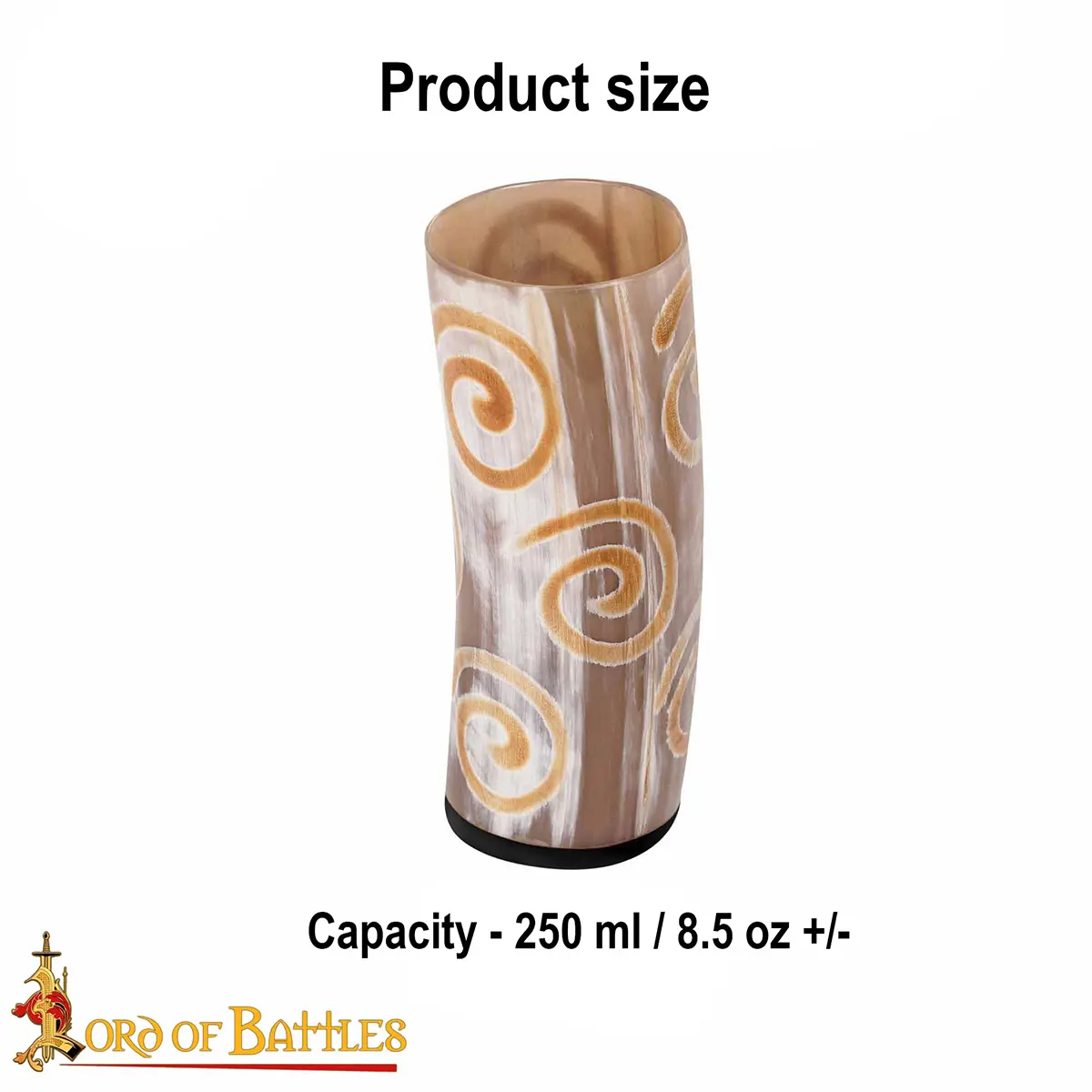 Medieval Viking Horn Tumbler – Handcrafted Drinking Vessel: Indulge in the traditions of the Viking age with this beer horn mug, handcrafted from genuine ox horn with time-honored methods. Each piece is individually shaped by nature, so every mug is unique in color, grain, and look. The burnt spiral detailing gives visual depth and shows the ornamental styles found in medieval times.
