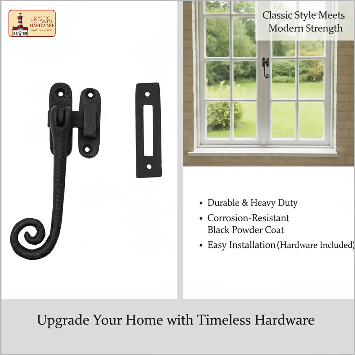 Perfect for medieval, gothic, or traditional-themed interiors, the set includes a decorative latch with a curled lever, a hook plate, and two strike plates—offering flexible mounting options to suit different casement window styles. Whether you’re working with standard hook-style hardware or mortise-style window frames, this versatile latch has you covered.