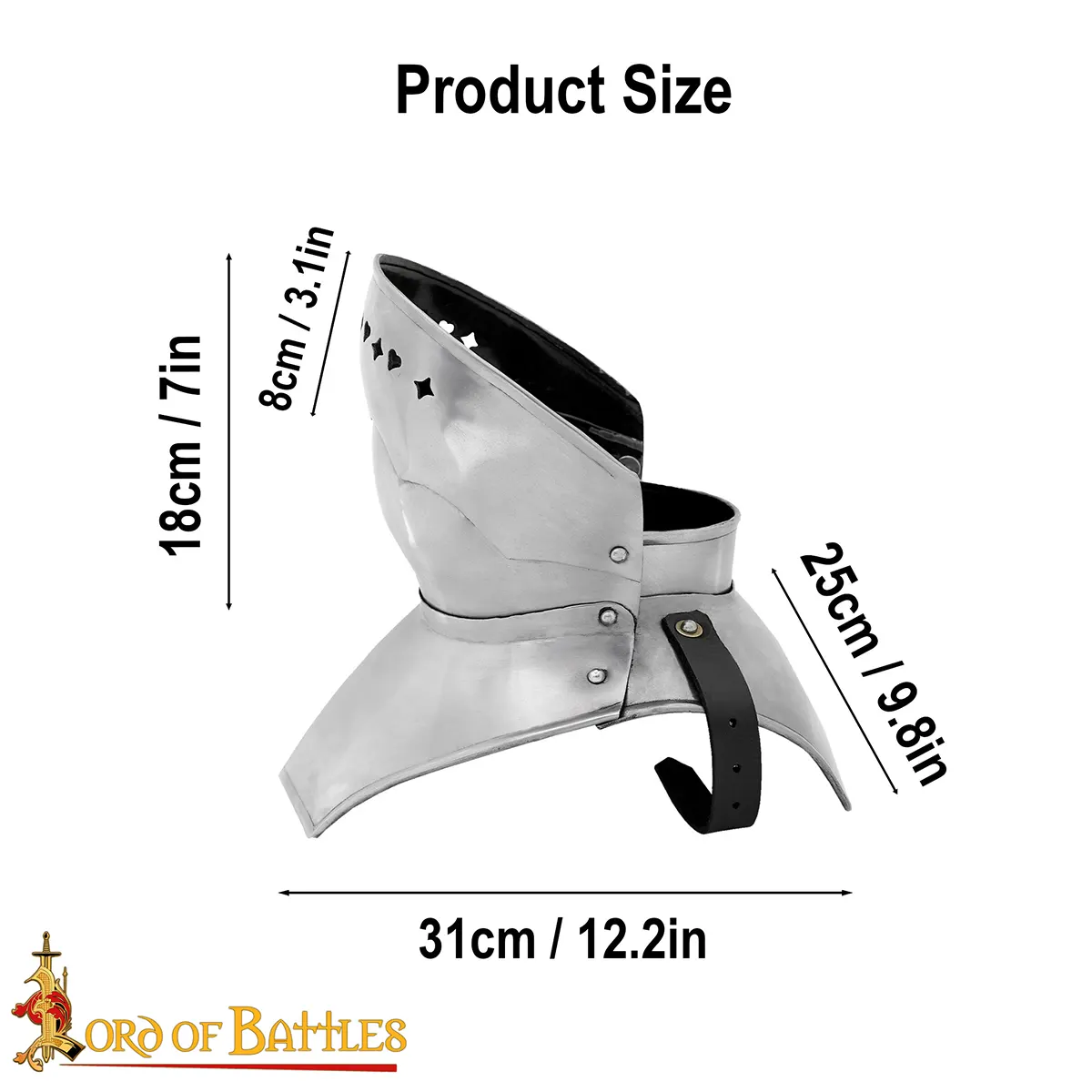 Inspired by the evolving battlefield tactics of the late Middle Ages, this Medieval Bevor offers both historical accuracy and robust protection. As the need for face and throat defense intensified in the 15th century, the bevor became an essential piece of plate armor—typically worn with open-faced helms such as the sallet.