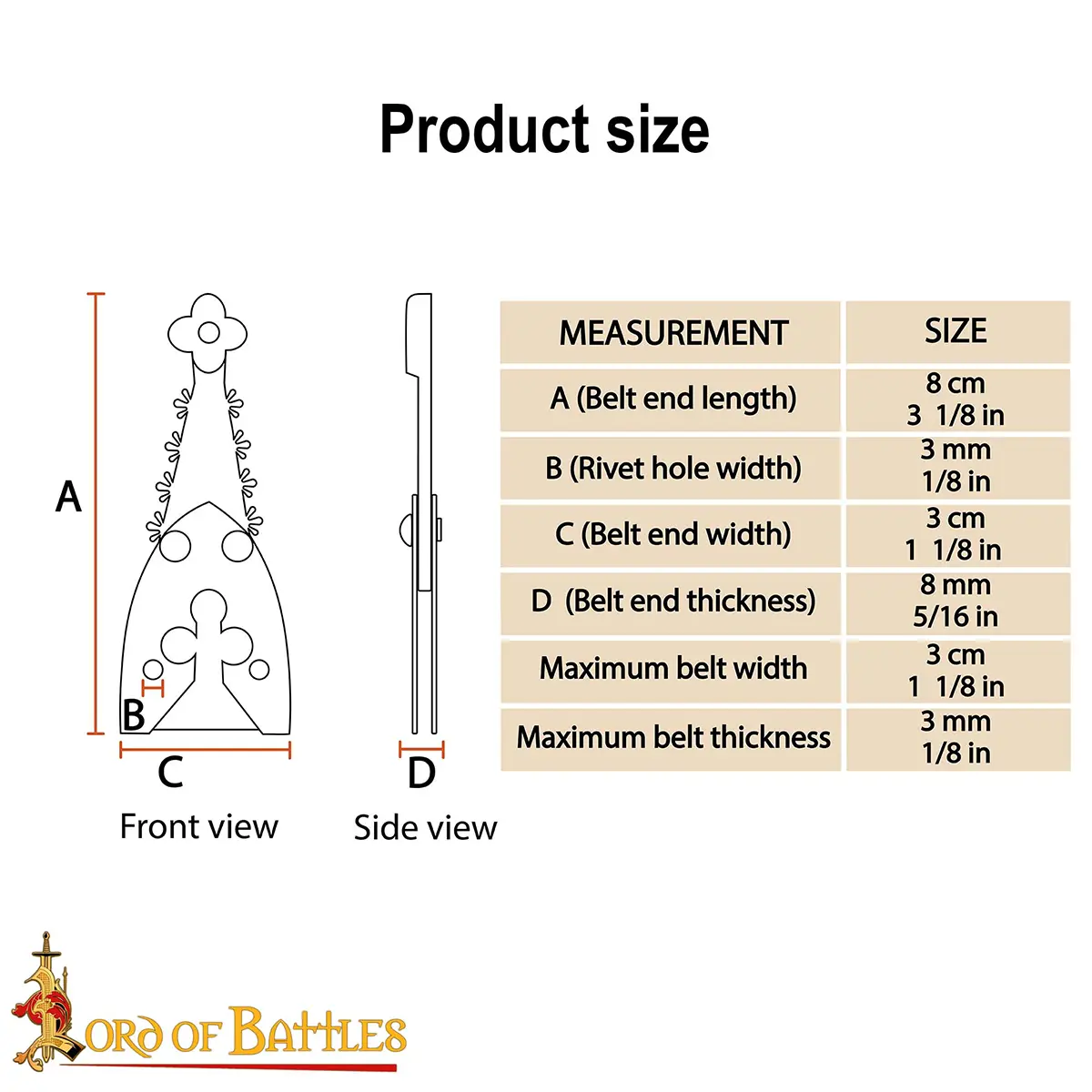 Designed for belts up to 3 cm wide, this Brass Belt Chape has two pre-punched holes and comes with mounting hardware, making it easy to attach to your leather belt. Not only does it reinforce the belt end to protect against fraying, but it also enhances your outfit with authentic historical flair.