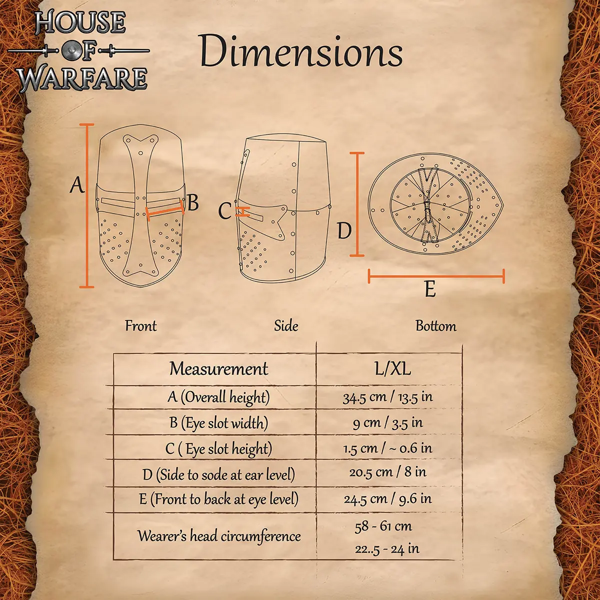 A series of breathing holes along the lower half of the helm ensures airflow and makes the helmet more wearable than its historical counterparts. It accommodates most head sizes comfortably when worn with proper padding.