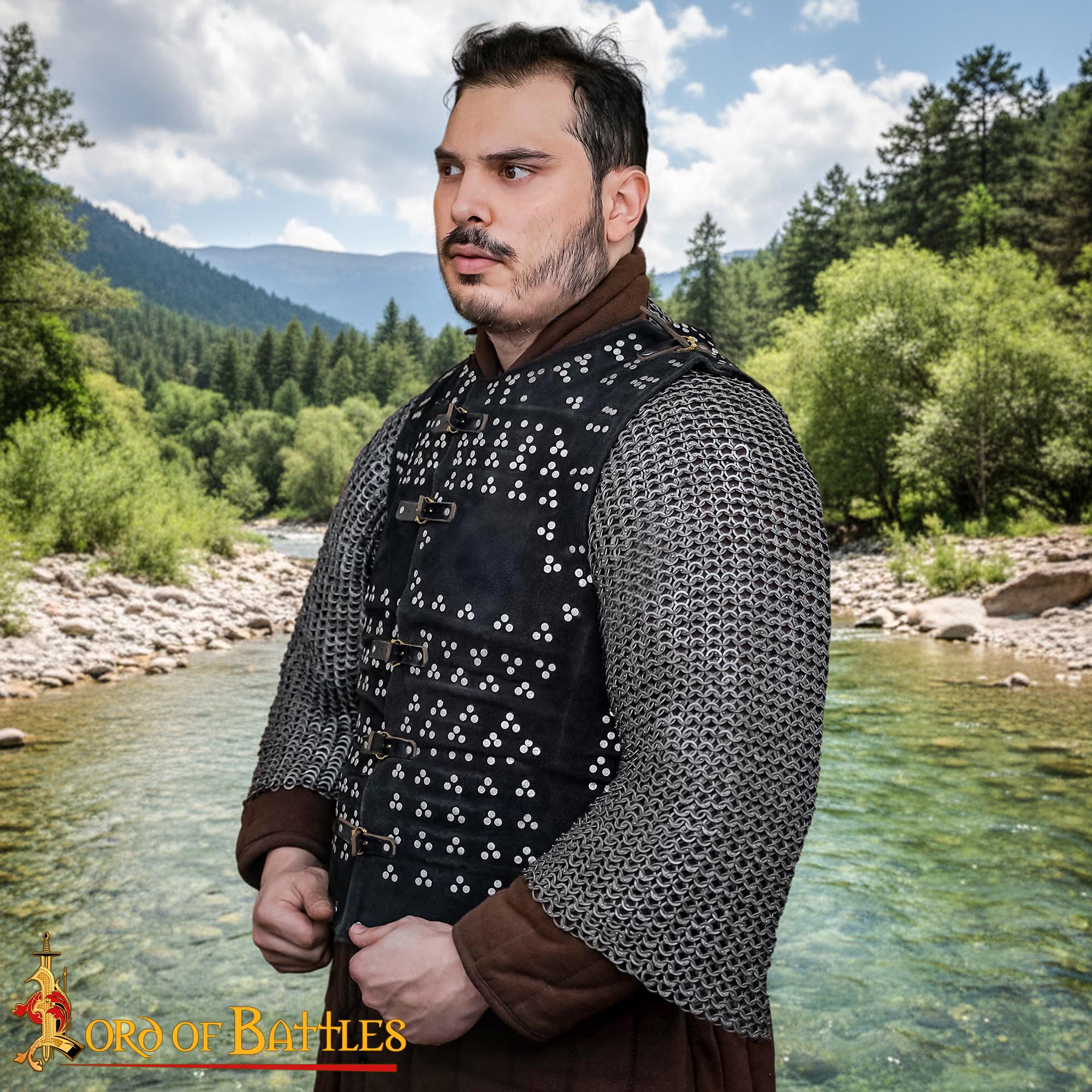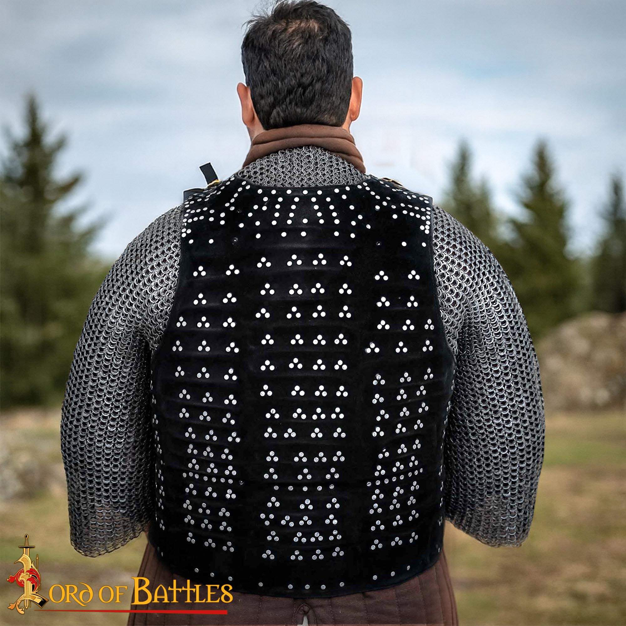 This Leather Brigandine armor is inspired by an original Brigandine armor at the Royal Armouries in Leeds, England. The visible rivet pattern is made from aluminium to prevent any corrosion and for a beautiful shiny look, suited for LARP, display and performance use.
