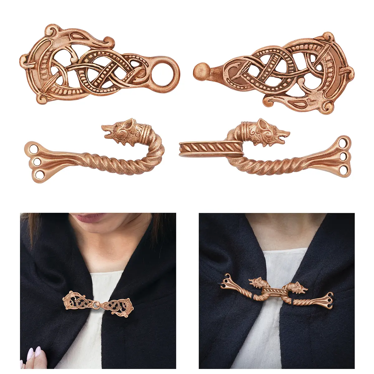 These fasteners can be stitched, laced, or threaded on your cloaks, shawls, or heavy garments, depending on your preferred method of use. Whether worn for LARP, stage costumes, or historical fashion, this set works as both a functional closure and a strong visual statement. The designs also pair well with viking cloak pins and other traditional accessories, while still standing out as a distinctive viking cloak brooch set.