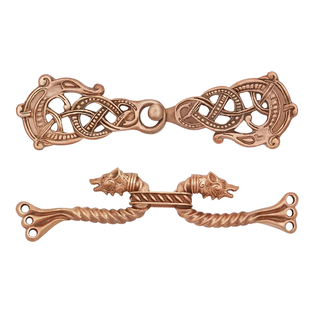 One clasp has a flowing knotwork with dragon or serpent heads, a style linked to Viking art forms such as Borre and Urnes. The other clasp shows strong animal-head terminals, often described as Celtic in style, though similar wolf and beast motifs were widely used across Viking cultures as well. Together, these pieces show the shared visual language of the Norse and Celtic worlds.