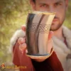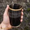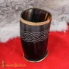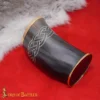 Around the upper portion of the horn, a hand-engraved knotwork design wraps around the chalice. Knotwork patterns are commonly seen in Viking and Norse art and symbolize eternity, connection, and the cycle of life.