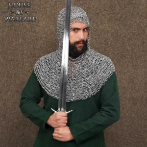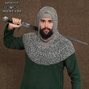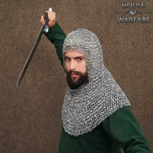 With 10mm internal diameter riveted round rings, this coif mirrors the craftsmanship of historical European mail, with a drape that flows naturally over the head, neck, and shoulders. The combination of riveted and solid rings not only enhances durability but also ensures flexibility which is essential for active roleplay scenarios.