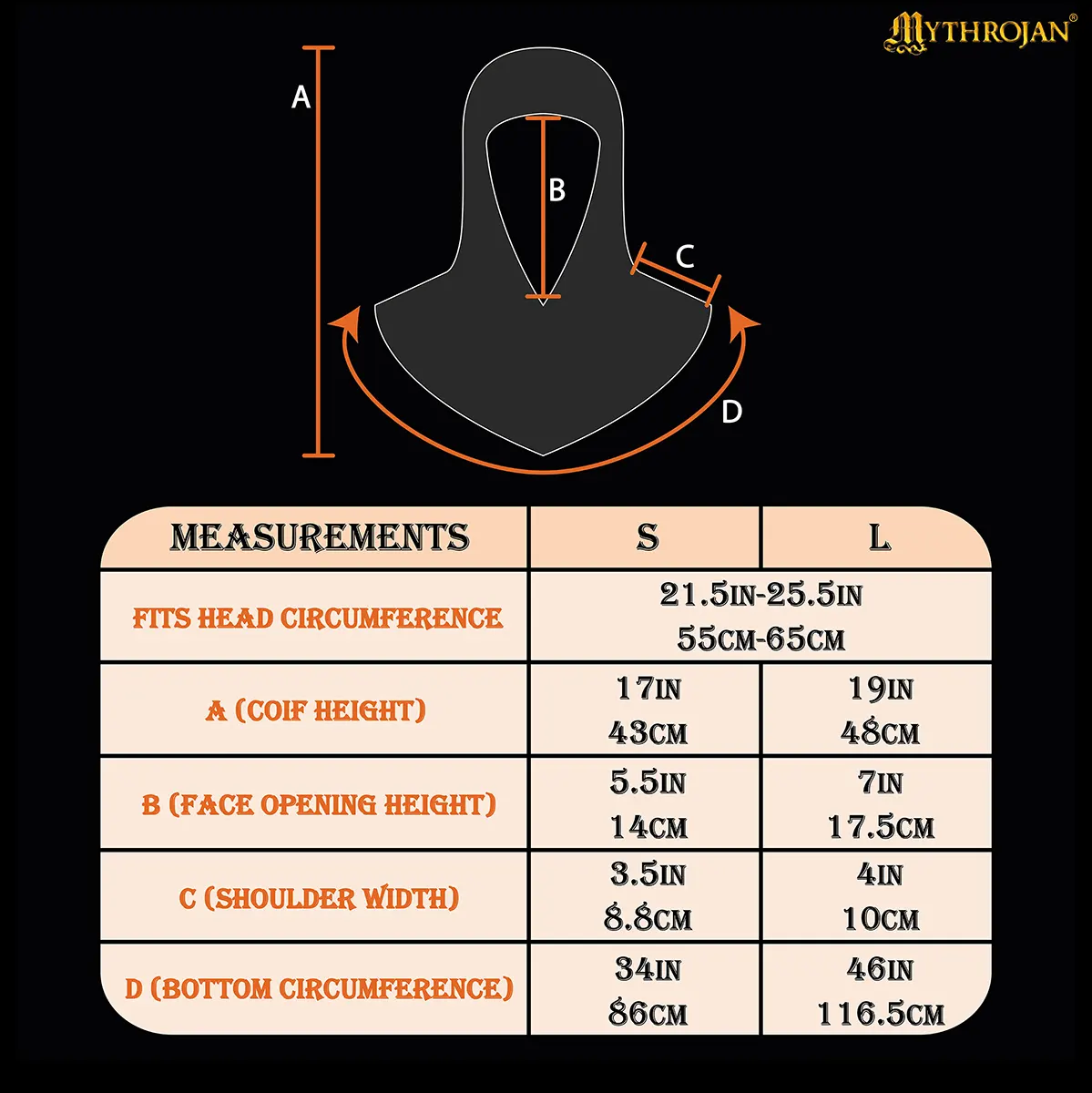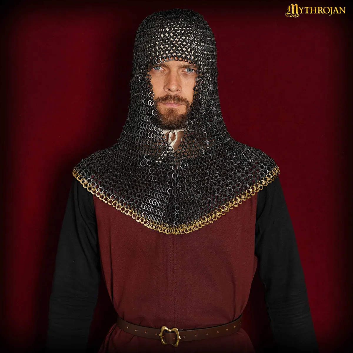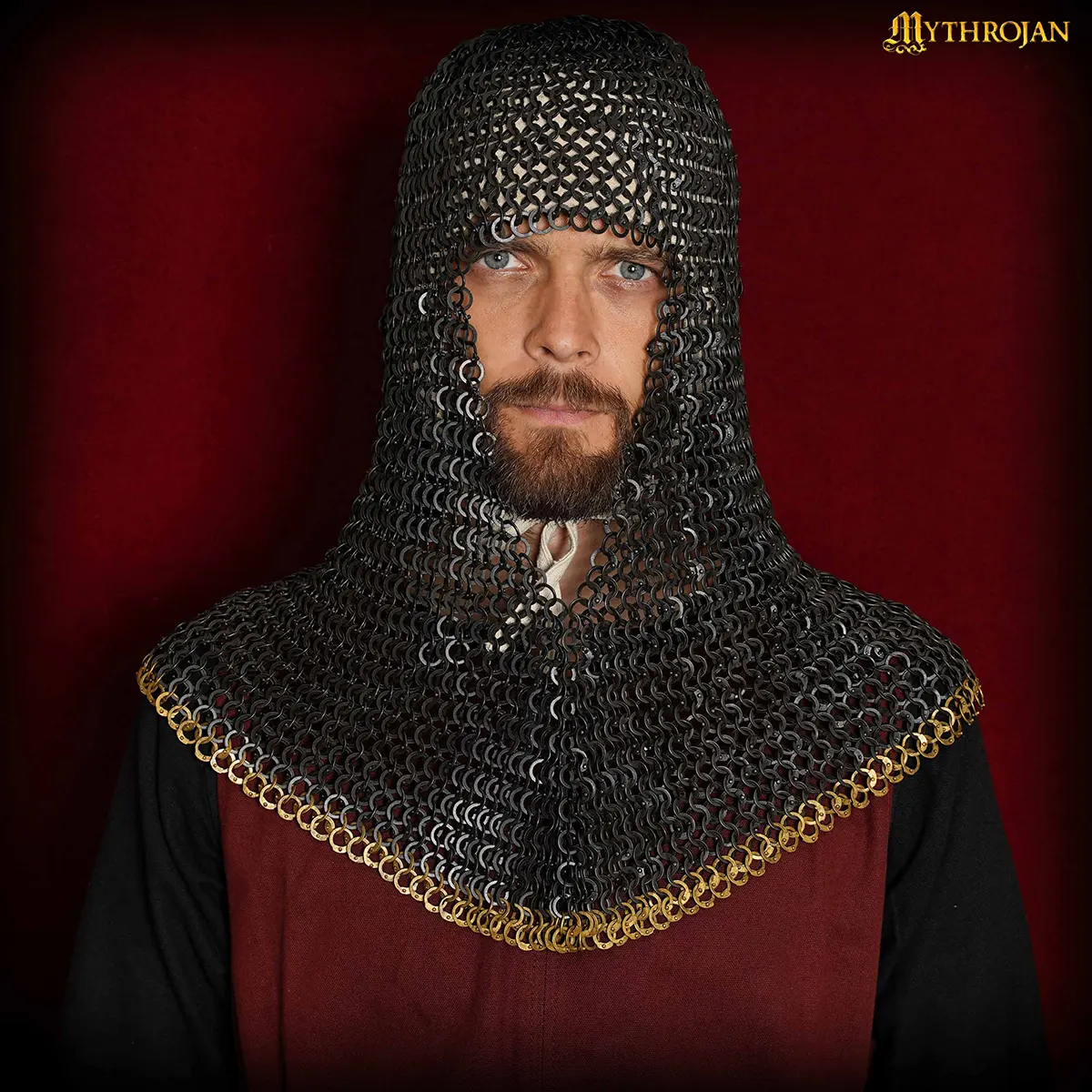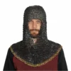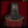Designed to cover the head, neck, and shoulders, this coif offers reliable protection while maintaining excellent mobility. Its riveted construction ensures it can endure demanding use, while the brass trim elevates it beyond a mere armor piece into a statement of medieval artistry. Whether you’re stepping into a reenactment battlefield, performing on stage, or displaying it as part of your collection, this coif embodies both strength and grandeur