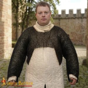 This Chainmail Half Hauberk is crafted from mild steel rings using a combination of round riveted rings and alternating flat solid rings, a historically accurate method used in medieval Europe. It has the classic European 4-in-1 weave, where each ring connects with four others, for flexibility with strong protection.