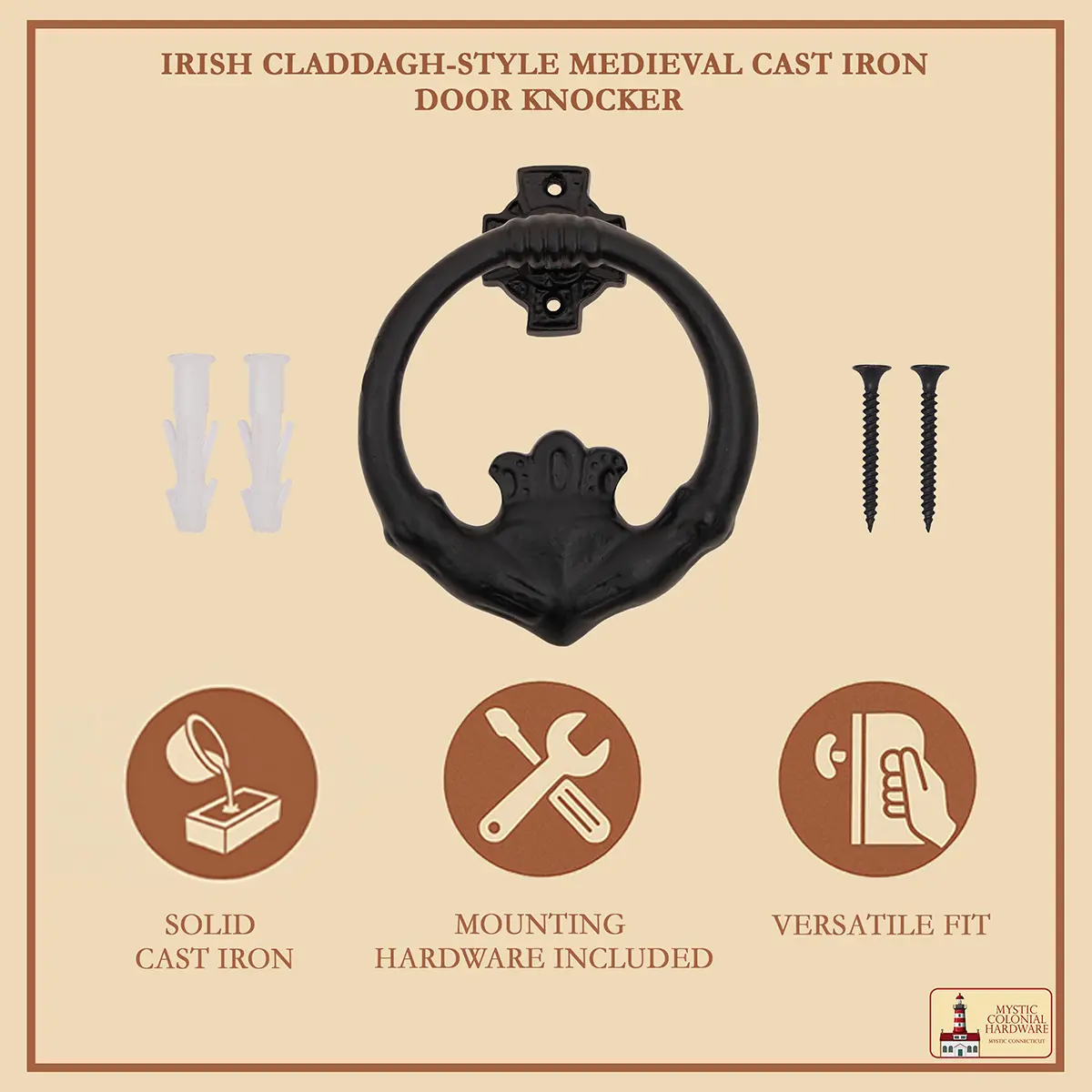 At the center of the design lies the iconic Claddagh symbol—a heart representing love, hands symbolizing friendship, and a crown denoting loyalty. This timeless motif adds depth and character to your home’s exterior, making this door knocker more than just a piece of hardware—it’s a heartfelt welcome.