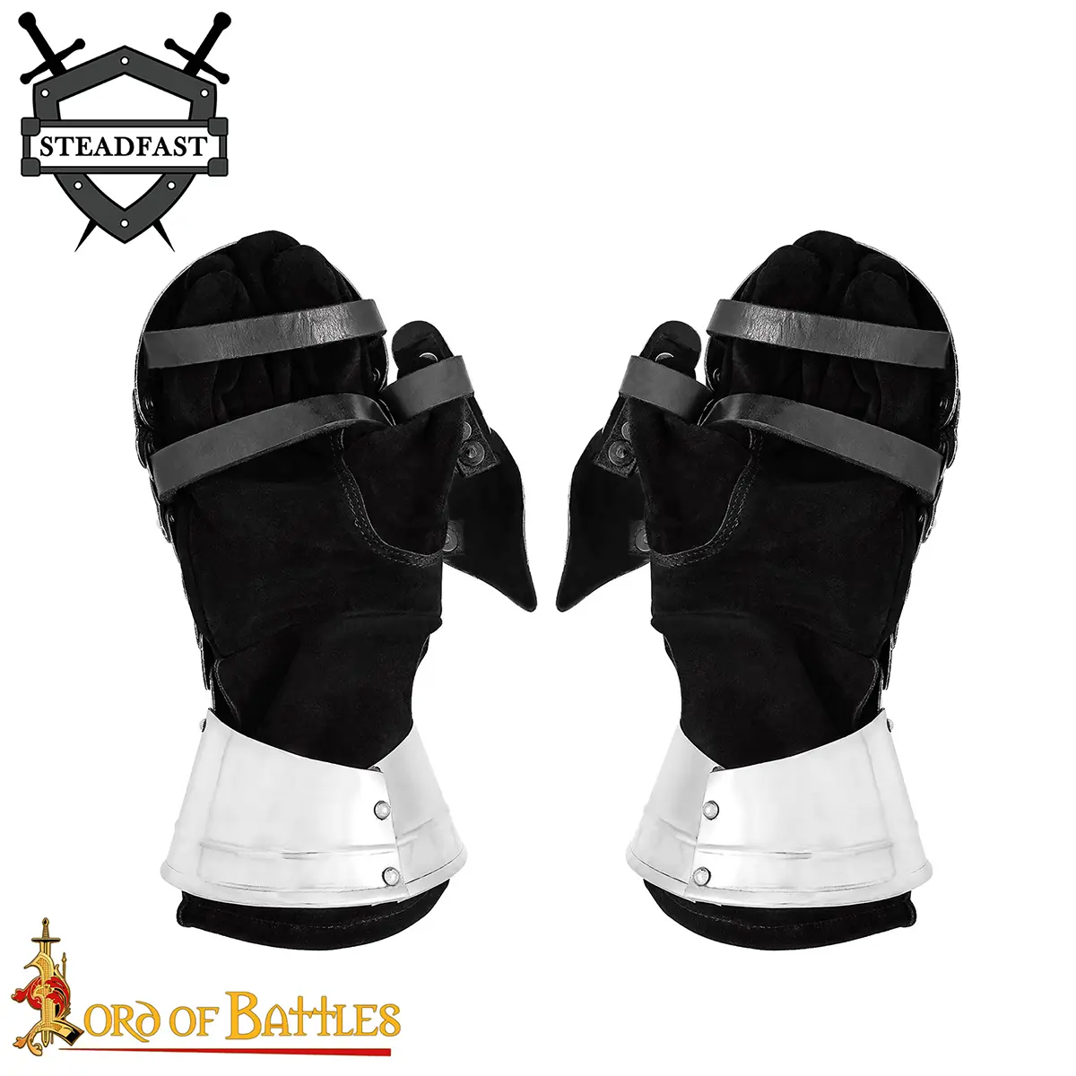 Inside, a soft suede leather lining offers comfort while ensuring a firm grip on weapons, making these gauntlets ideal for swordplay, pole arm use, or display. Adjustable leather straps allow a secure, custom fit, while the full articulation of the fingers ensures practicality on the field.