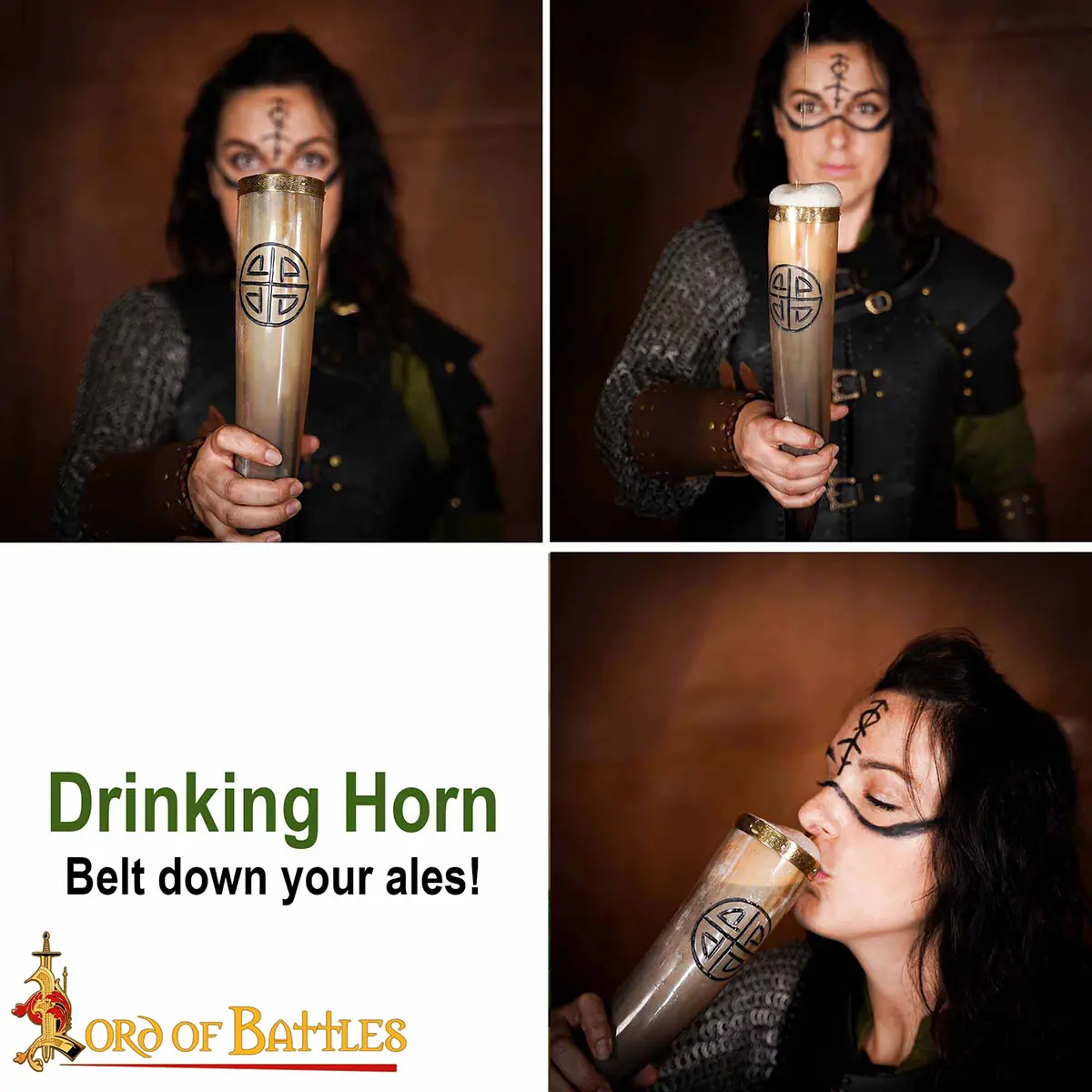 Pour yourself some well-aged mead in our Viking shield knot Crocodile Horn Drinking Horn; after all, what more do the victorious warriors need after wiping out their foemen? It is ornately decorated with PURE BRASS RIM AND TIP, making it visually attractive and the best choice to gift to your loved ones! Since we love to care for our natural products as much as you do, we supply this horn with high quality, sturdy, cotton canvas bag that will keep it safe and protected for years to come.