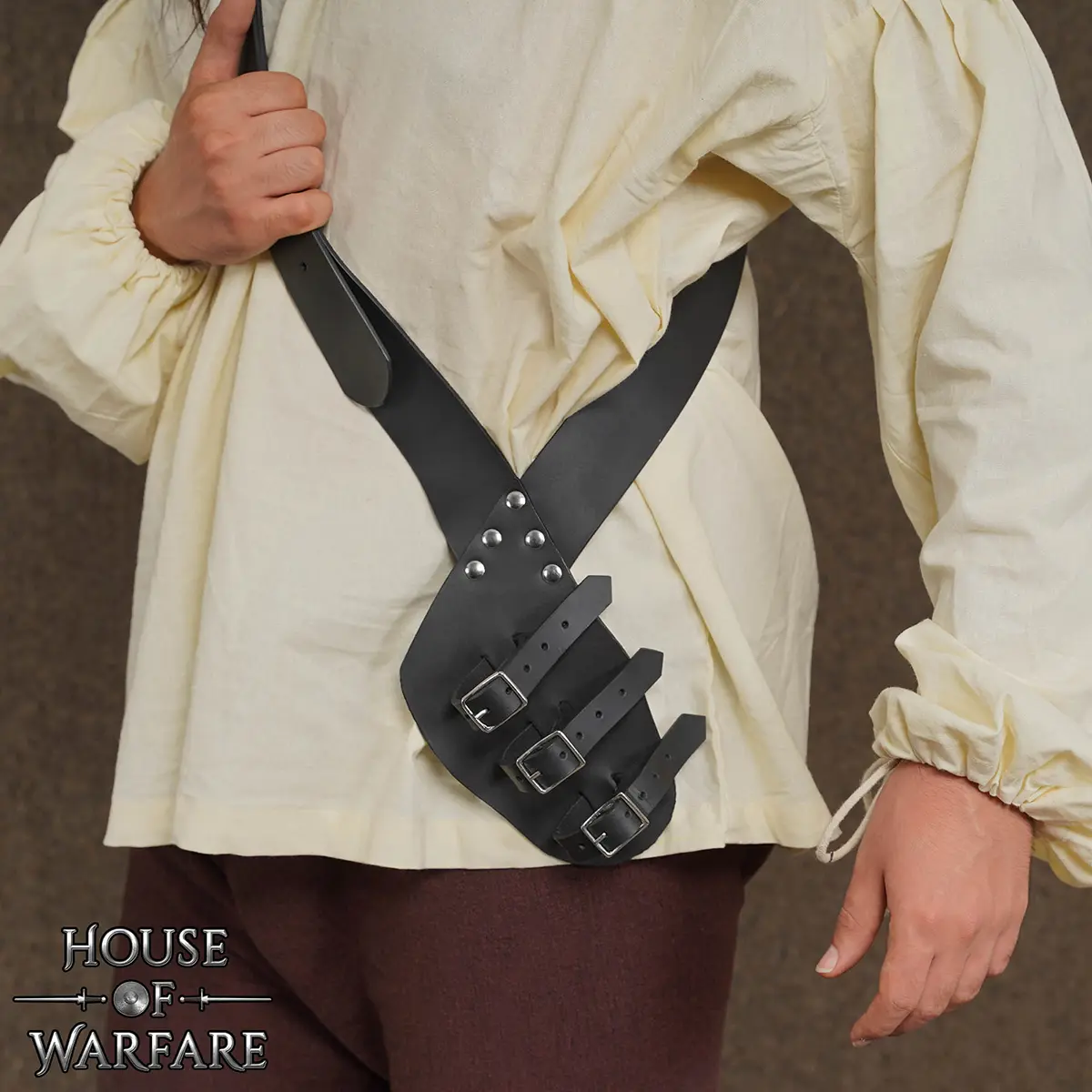 A large central buckle secures the cross body leather baldric around the chest. With multiple adjustment holes, it can be fitted comfortably to different torso sizes.
