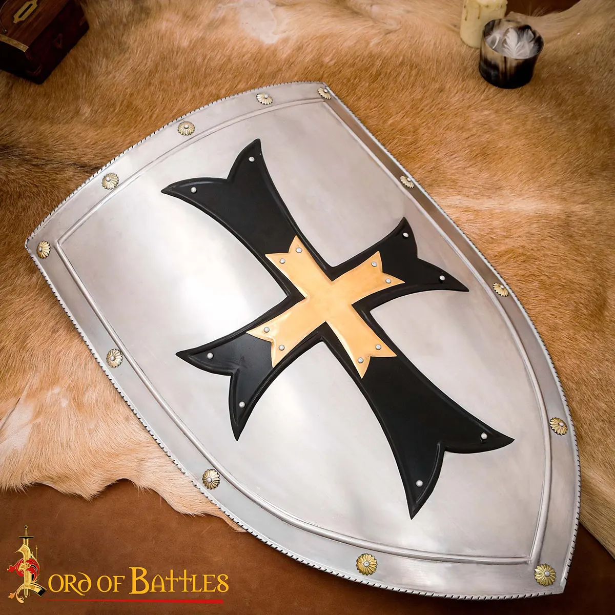 Are you looking for a captivating piece to elevate your medieval fantasy setting? Introducing our Fantasy Knight Steel Shield, a handcrafted masterpiece made from durable 18 gauge mild steel. Measuring at 28 x 20 inches, this shield not only serves as an impressive decorative item but also enhances your historical reenactments and cosplay events. Designed with meticulous attention to detail, the shield features a beautifully adorned cross motif, centered with a pure solid brass cross that adds elegance and character.