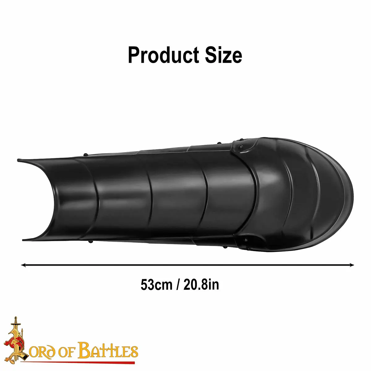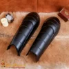 - These greaves are handmade from 18 gauge mild steel and are sturdy yet lightweight, ideal for fantastic LARP and Cosplay outfits. When worn, they are firmly held in place by two robust leather straps at the back. It has a total length of about 53 cm, an upper curved width of about 29.5 cm, and an inner curved width of about 24.5 cm.