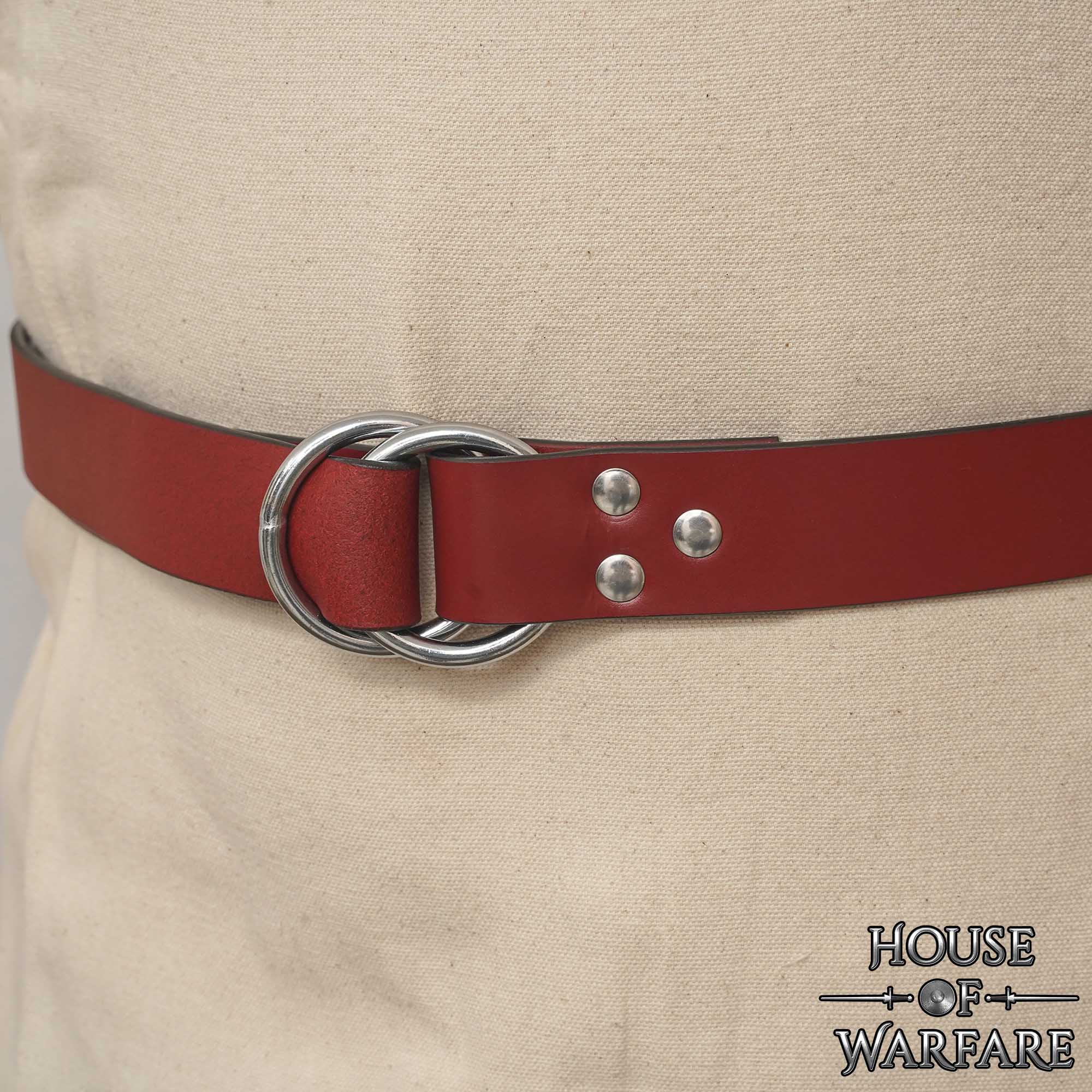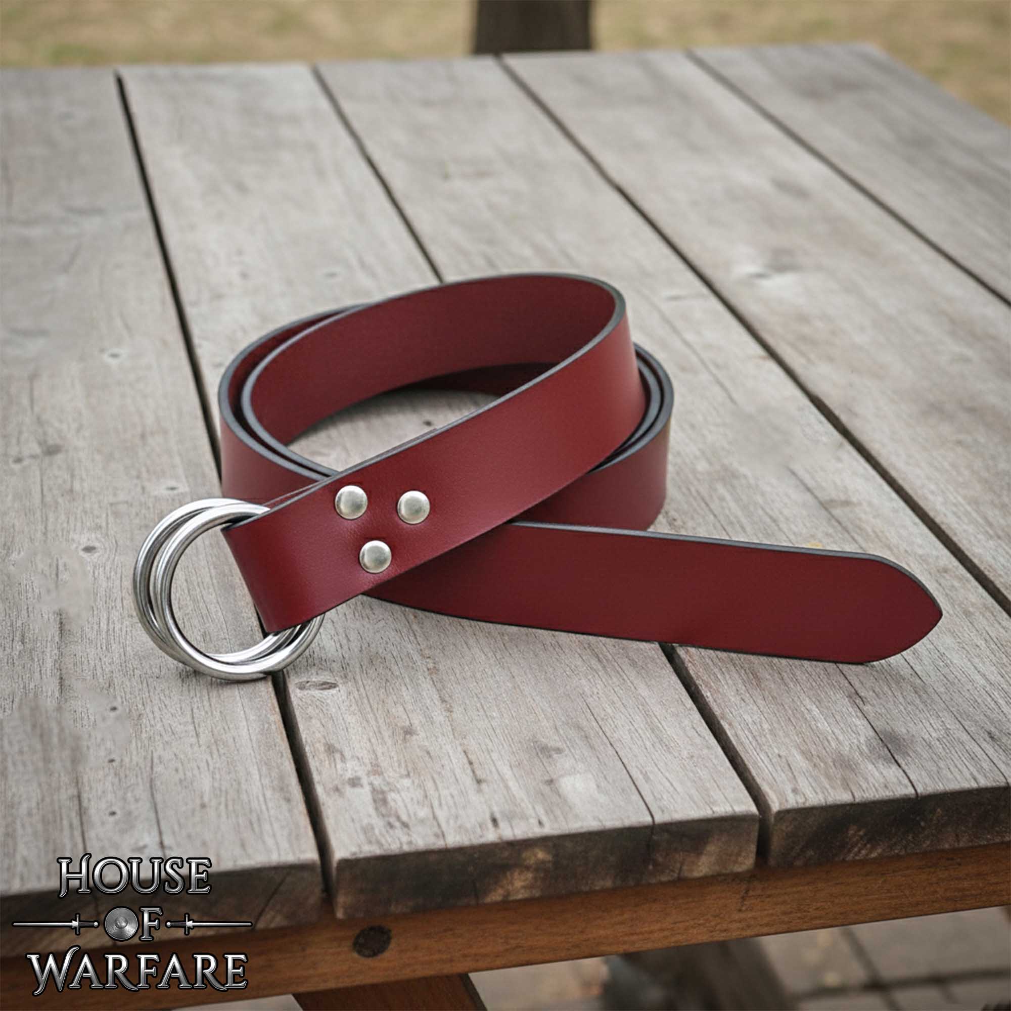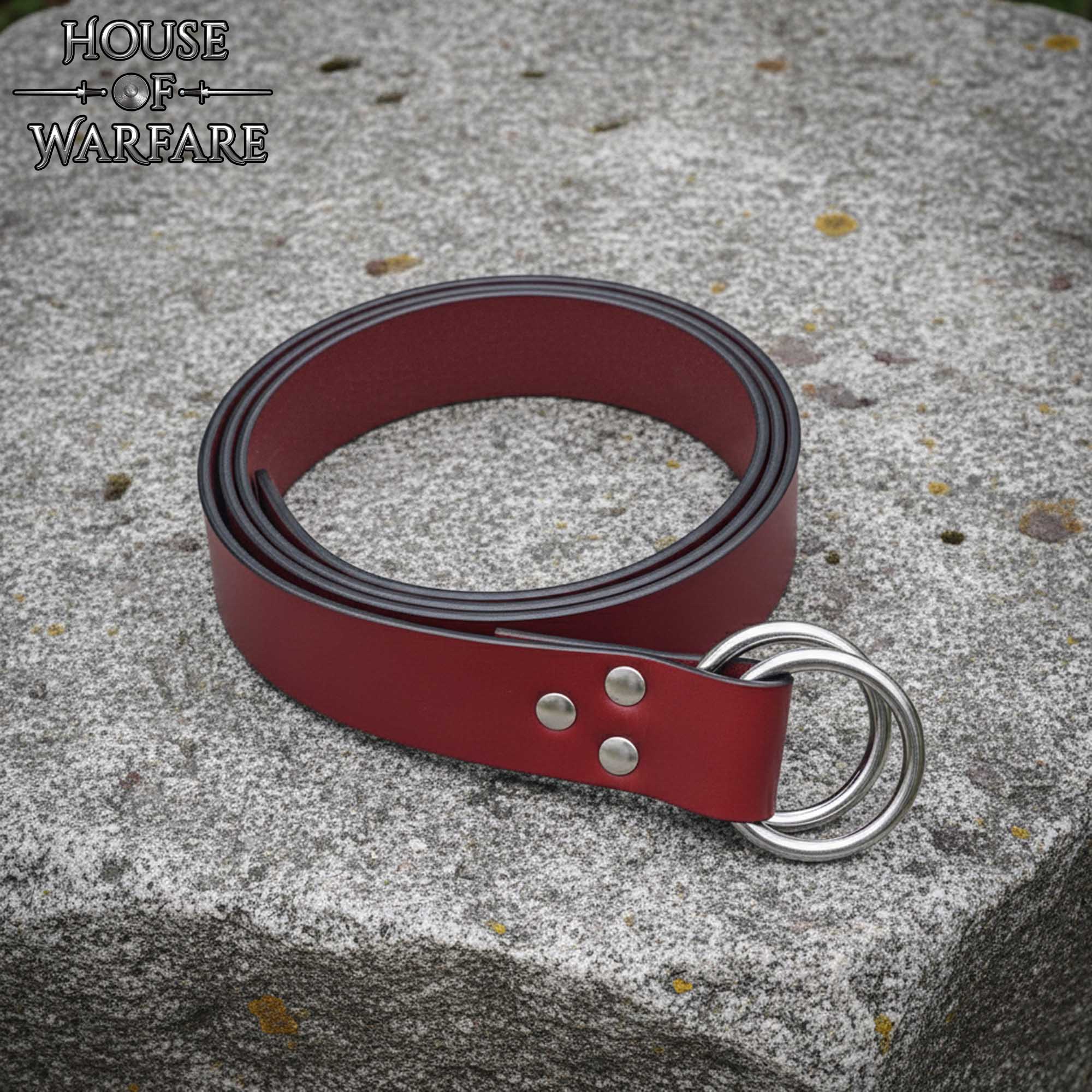 Medieval Leather Belt with Nickel Plated Rings: This handcrafted Double O Ring Belt brings together medieval, Viking, and fantasy styling in a bold look. Made from genuine 1.8–2 mm leather with clean edges, the belt is durable with a sleek appearance. The bright red tone enhances any costume or outfit’s look, ideal for LARP, fairs, cosplay, or everyday fashion. The front closure design has two nickel-plated O rings, for shine, rust-resistance and protection against staining your clothes. This is adjustable, secure and functional across a wide range of attire.