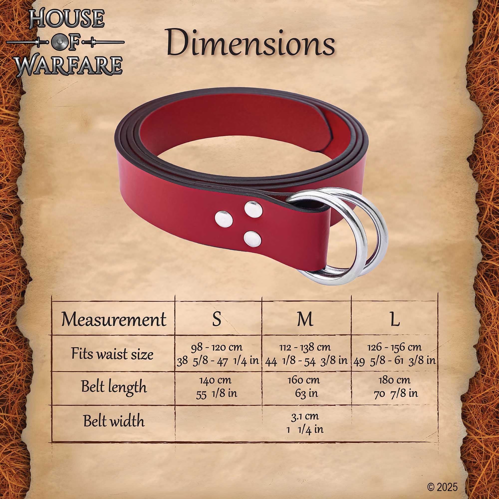 Available in 140 cm, 160 cm, and 180 cm lengths, the belt accommodates various body types for wearing over tunics, dresses, gambesons, or trousers. The double O ring system gives a secure fastening and adjustability, and the styling options allow the belt to be worn knotted, cinched or draped as per choice. As a double O ring leather belt, it adds detail to outfits.