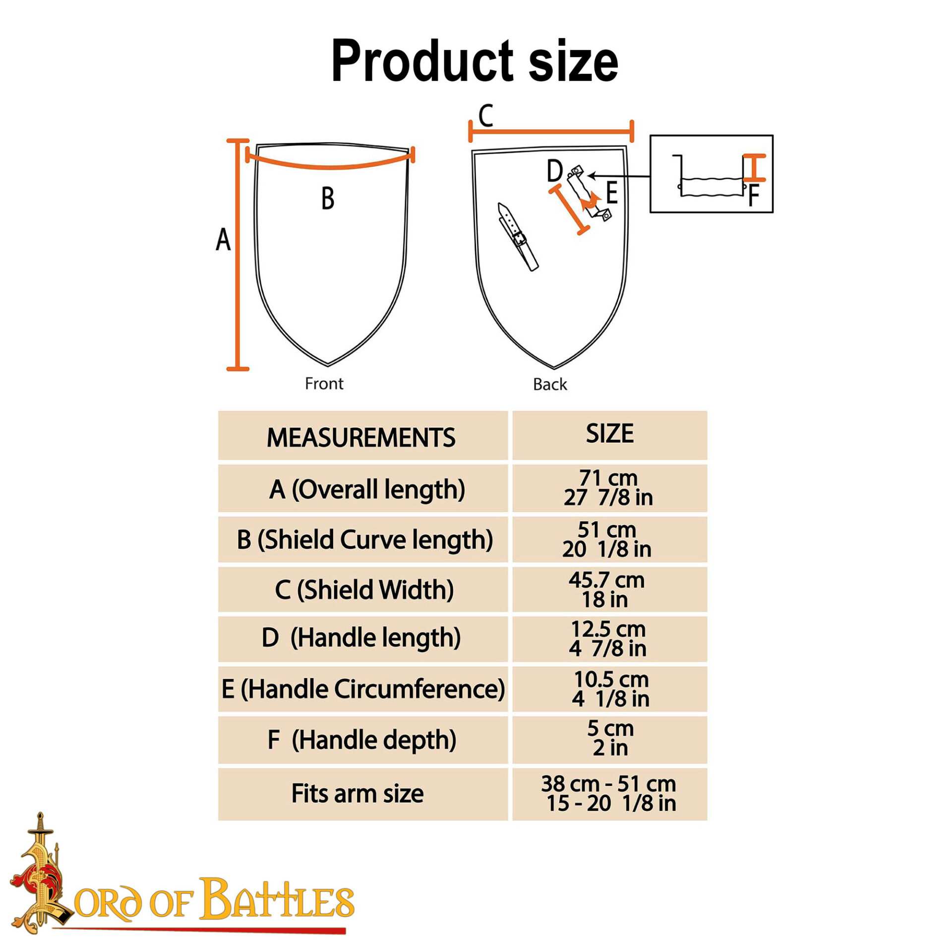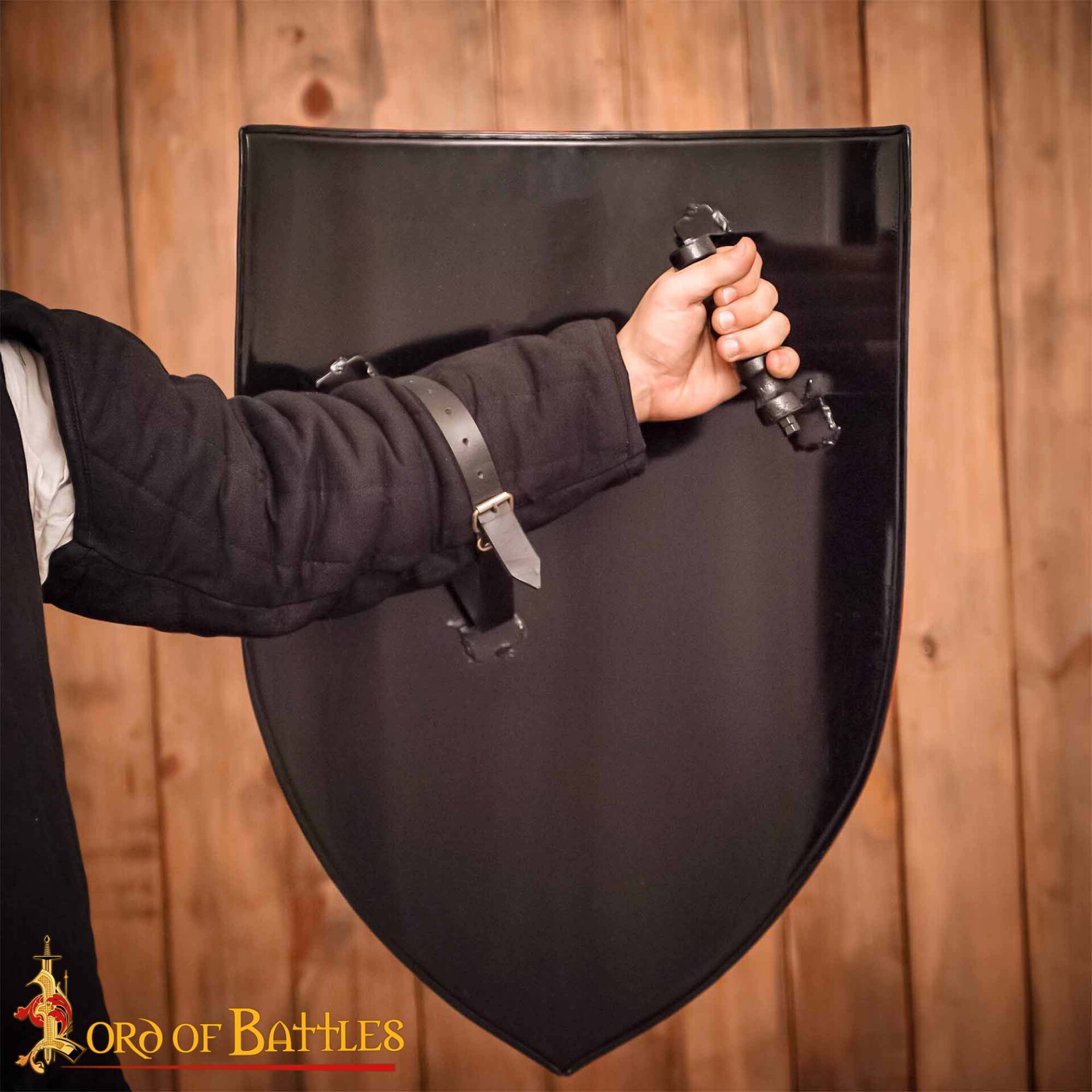 With a traditional heater-style profile, this shield is historically accurate and has a comfortable handling. The turned steel edge increases the longevity, adds strength to the frame and gives a safer handling compared to flat-edged shields. On the back, a solid steel handle and adjustable leather straps make it suitable for carrying, mounting, or performances.