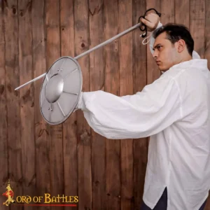 The Buckler shield was widely used from the 12th to 16th centuries by soldiers and for fencing purposes. Because it has a small size, it is suitable for close-quarters combat, especially when paired with swords, rapiers or daggers. The major reason why bucklers were made was because they were used for fast defense and hand control instead of full coverage.