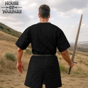 This Gambeson vest is a double-layer quilted garment which provides padding, comfort as well as flexibility during training or LARP events. It has a durable canvas cotton outer shell with internal multi-fibre wadding that helps in absorbing impact and also prevents chafing from the armor. The half-sleeve design is great because it provides better arm movement as well as helps with more airflow.