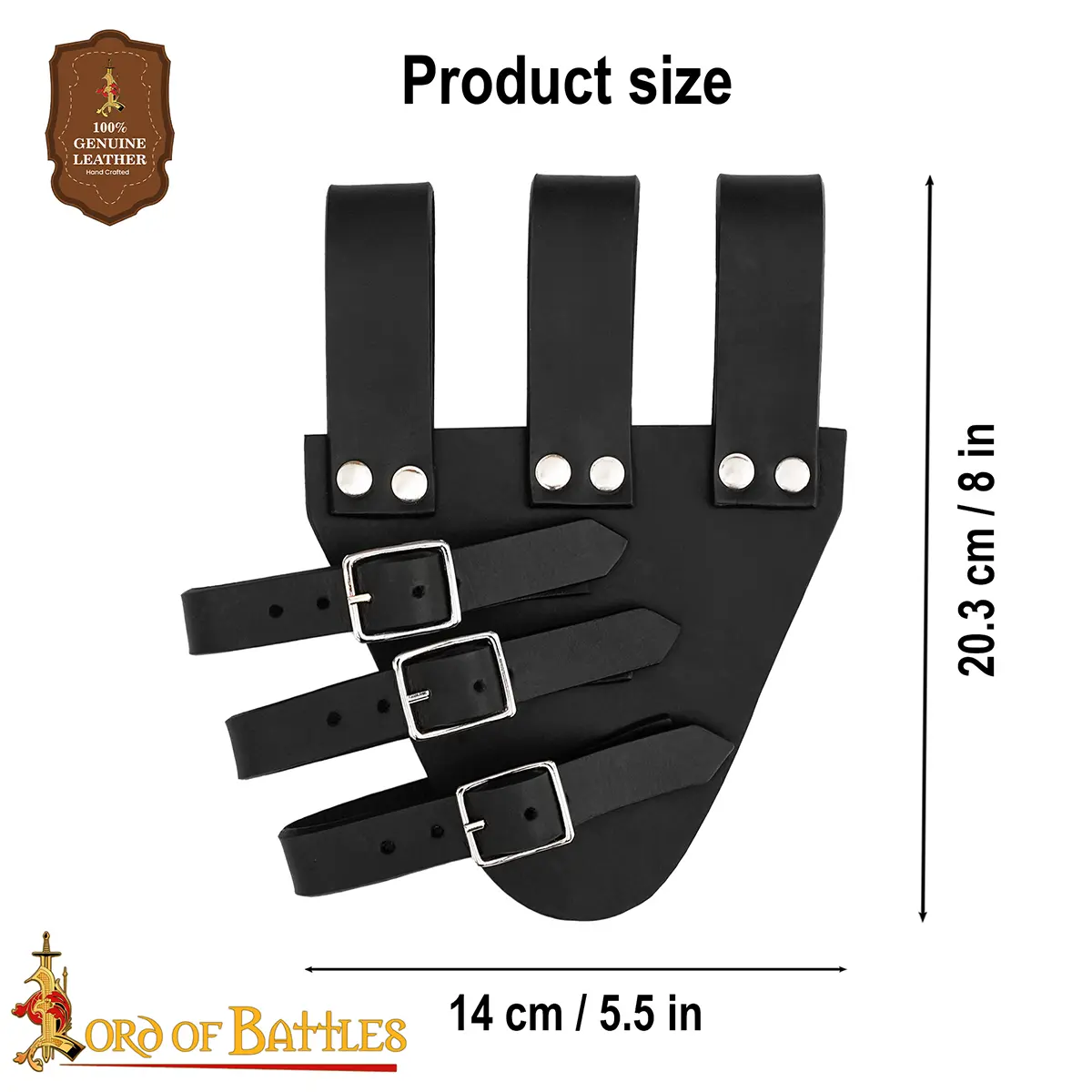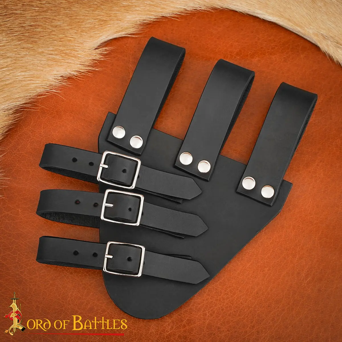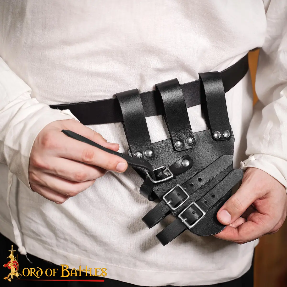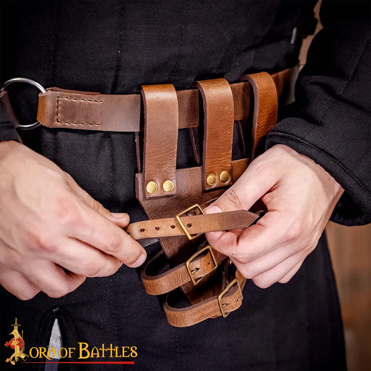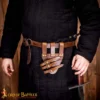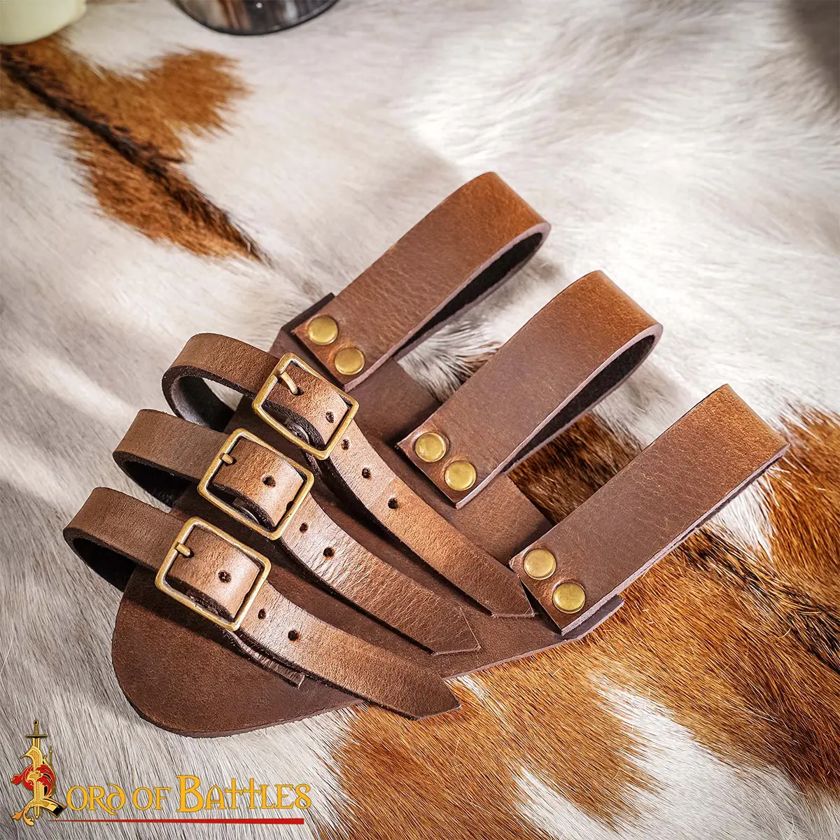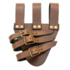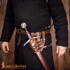 - Brown leather with solid brass buckles : Brass was widely used in medieval gear because it does not rust, forms a warm aged patina with time, and adds a classic historical look.