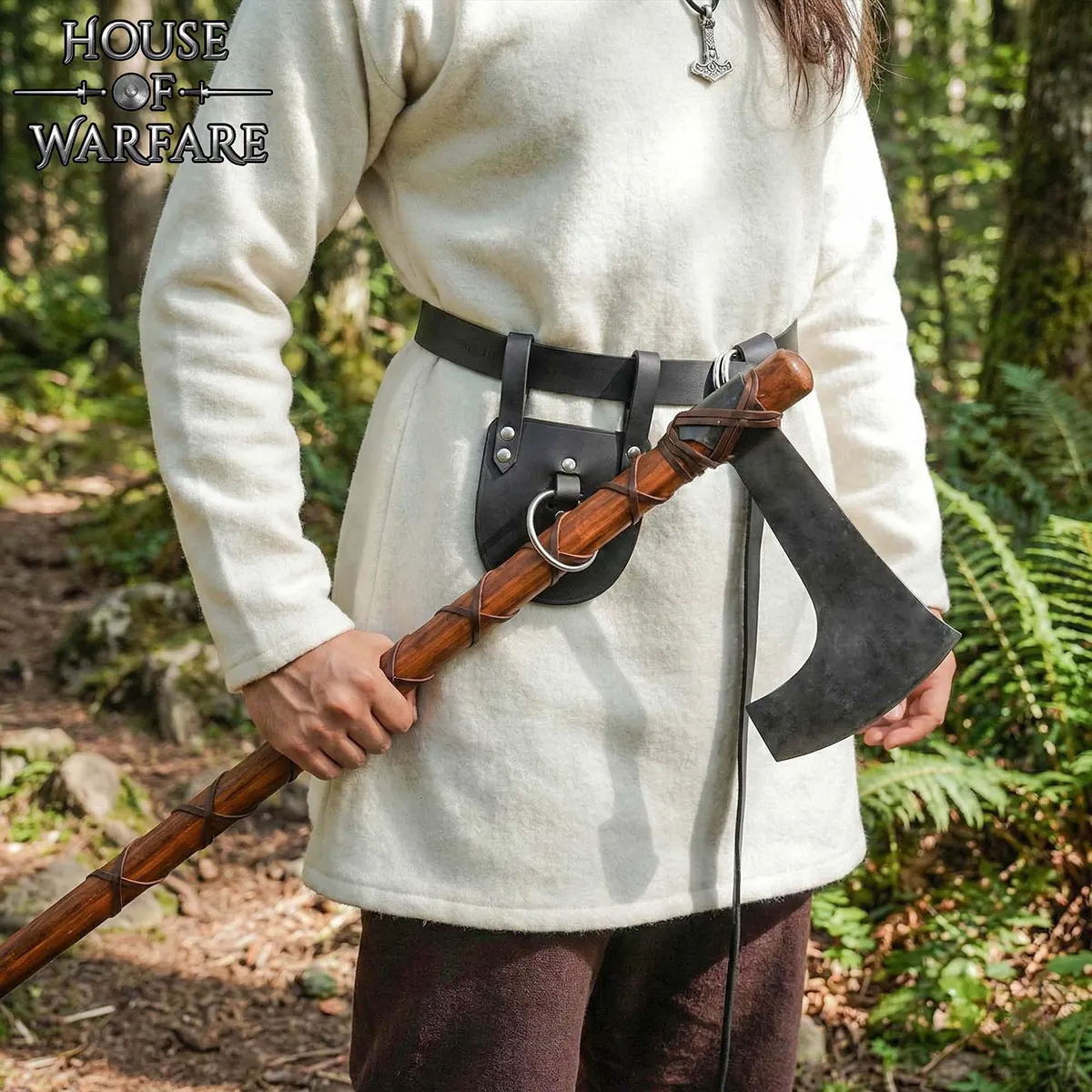 Strong Belt Mounting System: Two reinforced leather belt loops allow this axe belt holster to mount securely to your belt. The loops are riveted for long-term use. Once attached, the frog axe sits comfortably at your side, with balance while walking or participating in events.