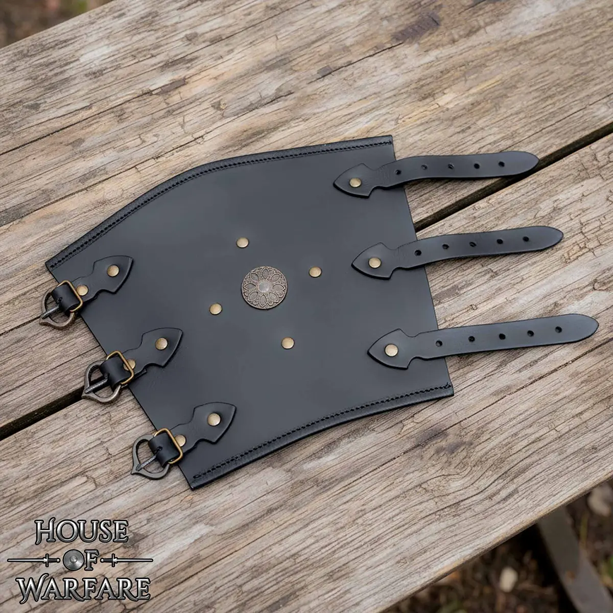 The addition of decorative brass accents at the center gives these black leather bracers a distinctive look, setting them apart from plain designs. Whether paired with armor, tunics, or fantasy attire, they enhance the overall look without overwhelming the outfit.
