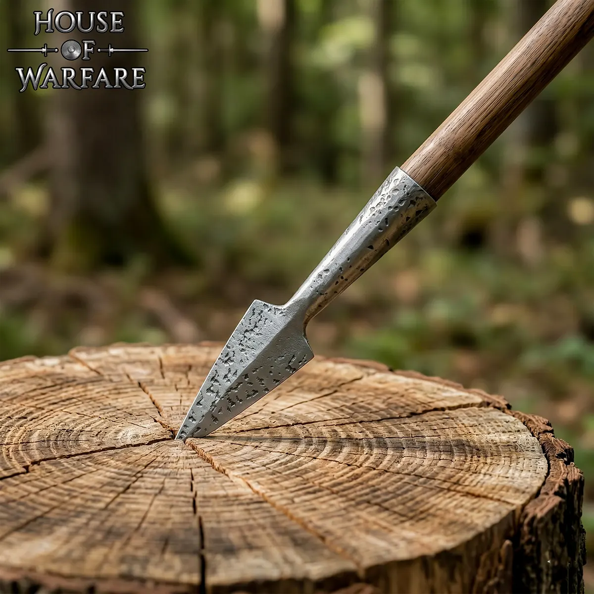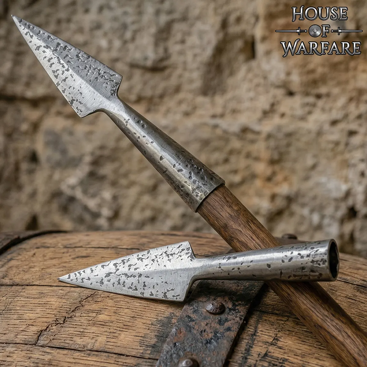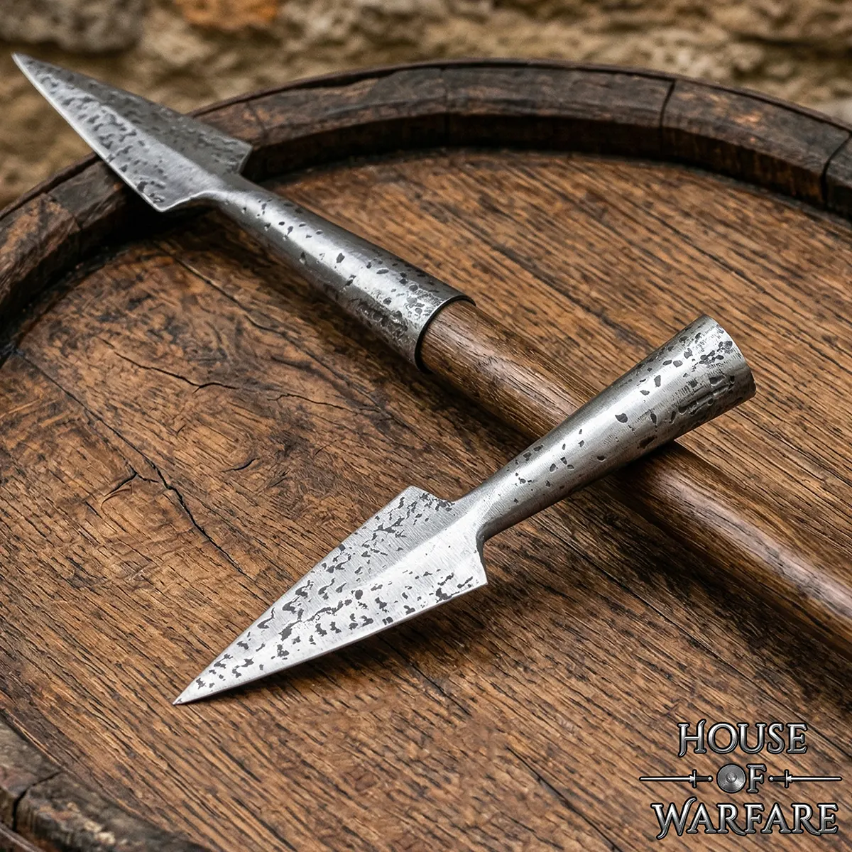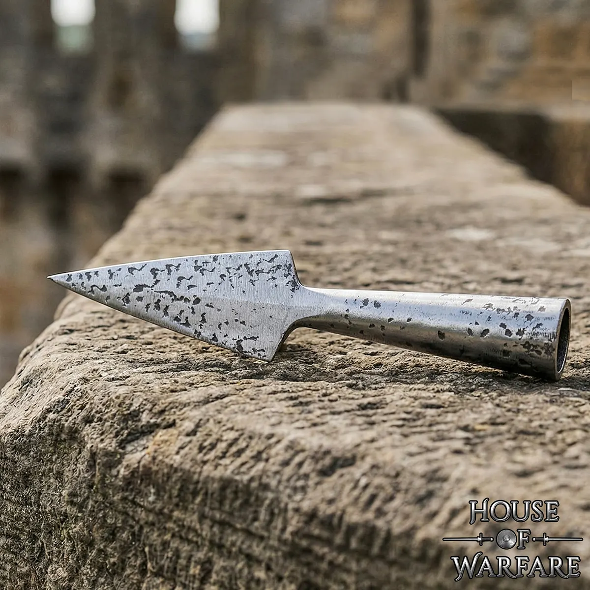 Craft your own throwing spear or pole weapon using the Small Spear Head. This historically styled spear head tapers to a point and has a central ridge. Made of steel, its hand forged construction results in a rugged, weathered appearance that suits all kinds of historical settings. This steel medieval arrowhead ends in a cone-shaped socket for attaching to your own wooden haft. If your historical reenactment calls for a throwing weapon, you can create your own ideal medieval spear with this small steel spear head.