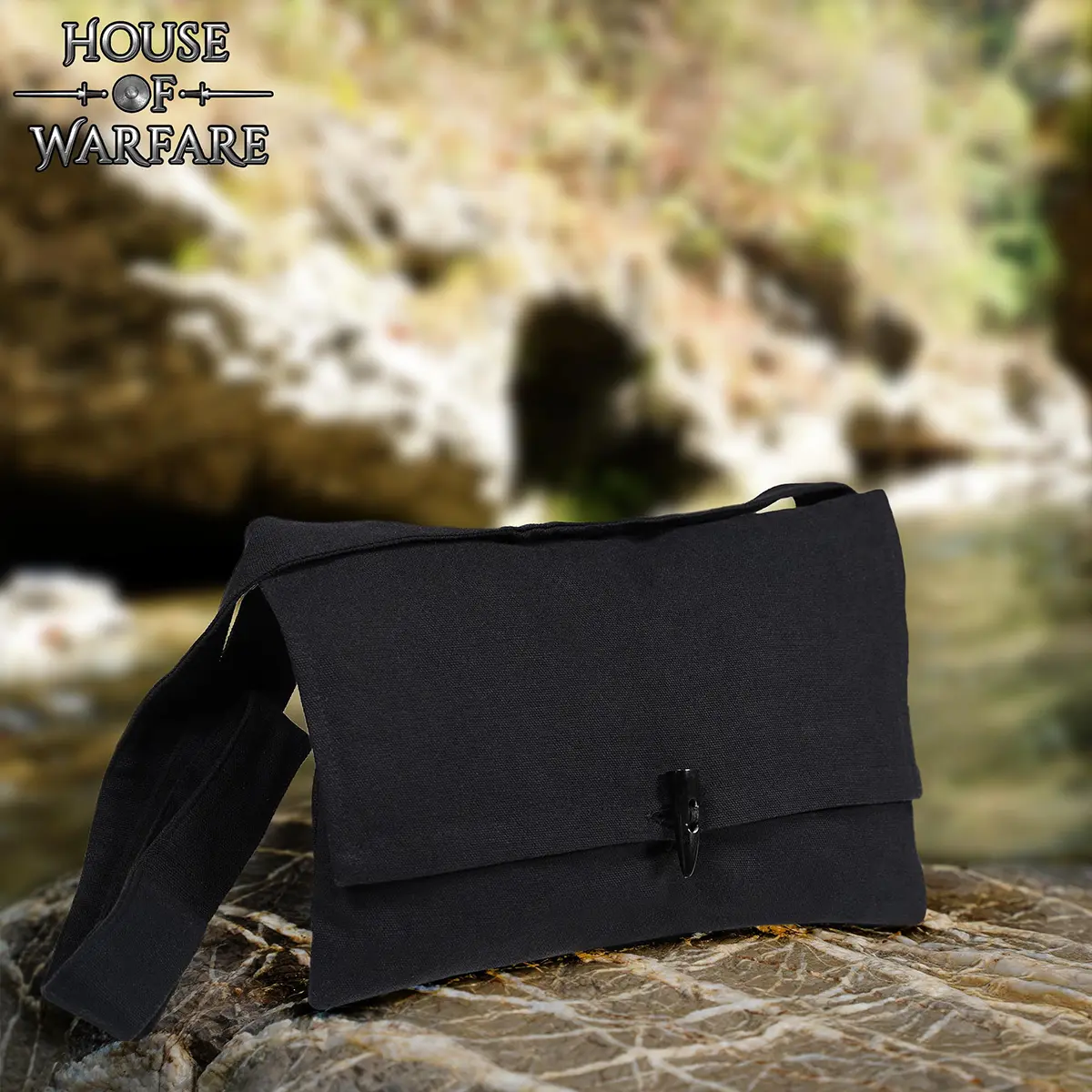 While walking in the shadows, keep your important items at hand with the Medieval Canvas Shoulder Bag in black at a LARP event or Renaissance faire. This cotton canvas bag features a front flap and fastens with a triangular horn toggle. It has a rectangular shape. The long shoulder strap is a fixed length. Its streamlined appearance will not detract from a decorative or modern outfit. This accessory also works wonderfully at fantasy events or historical conventions.