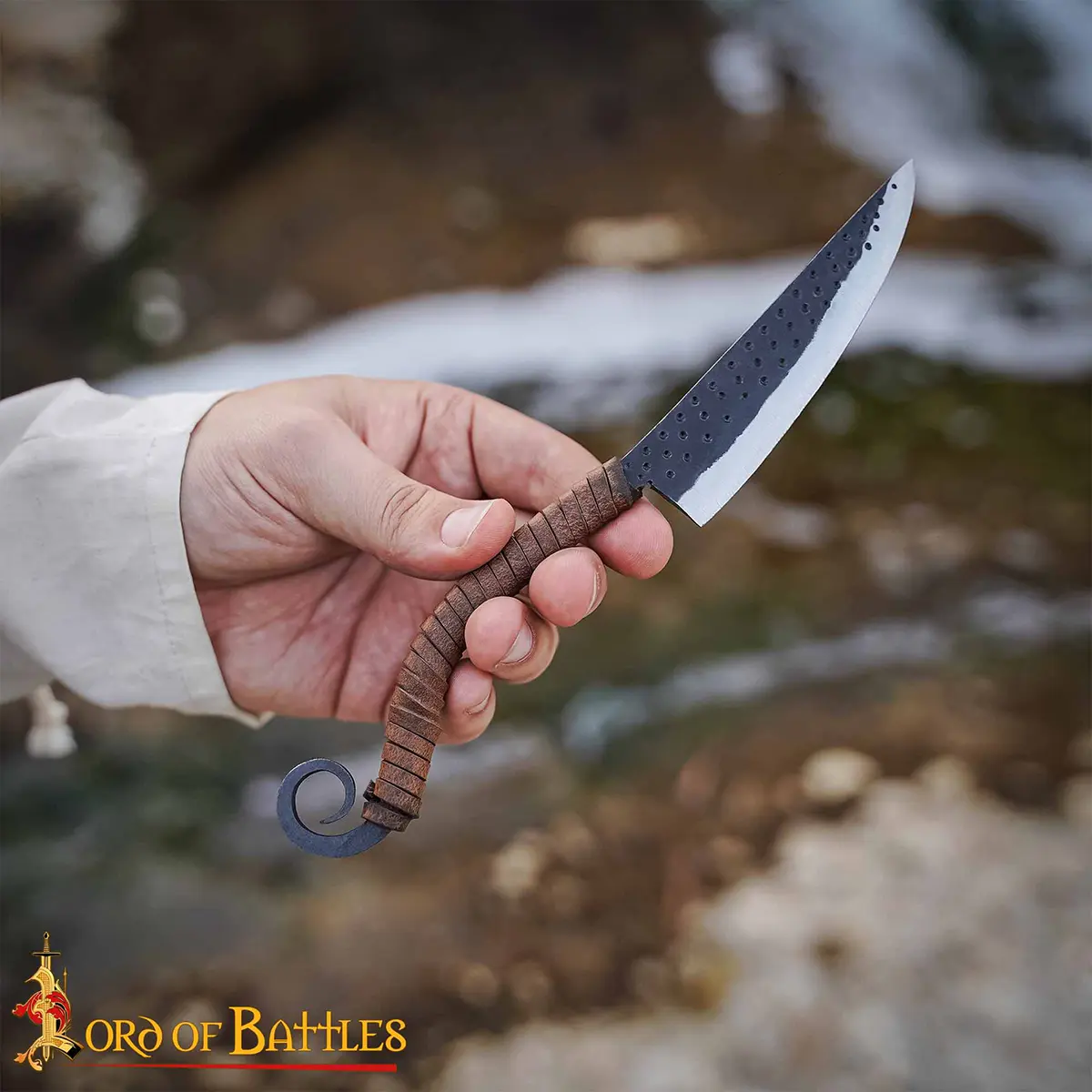 The blade is forged from durable iron and has a textured, hammered finish that gives it strong visual character and historical authenticity. The handle is wrapped in genuine leather, giving a secure and comfortable grip even during extended use. At the end of the handle, a forged scroll design gives balance, strength and a distinctive traditional look inspired by early blades.