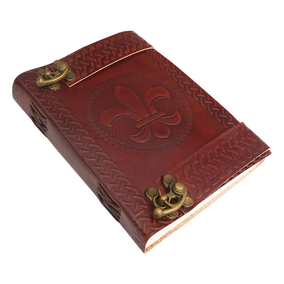 Handmade Leather Journal with Fleur-de-Lys Embossing – Vintage Notebook with Brass Lock & Handmade Paper