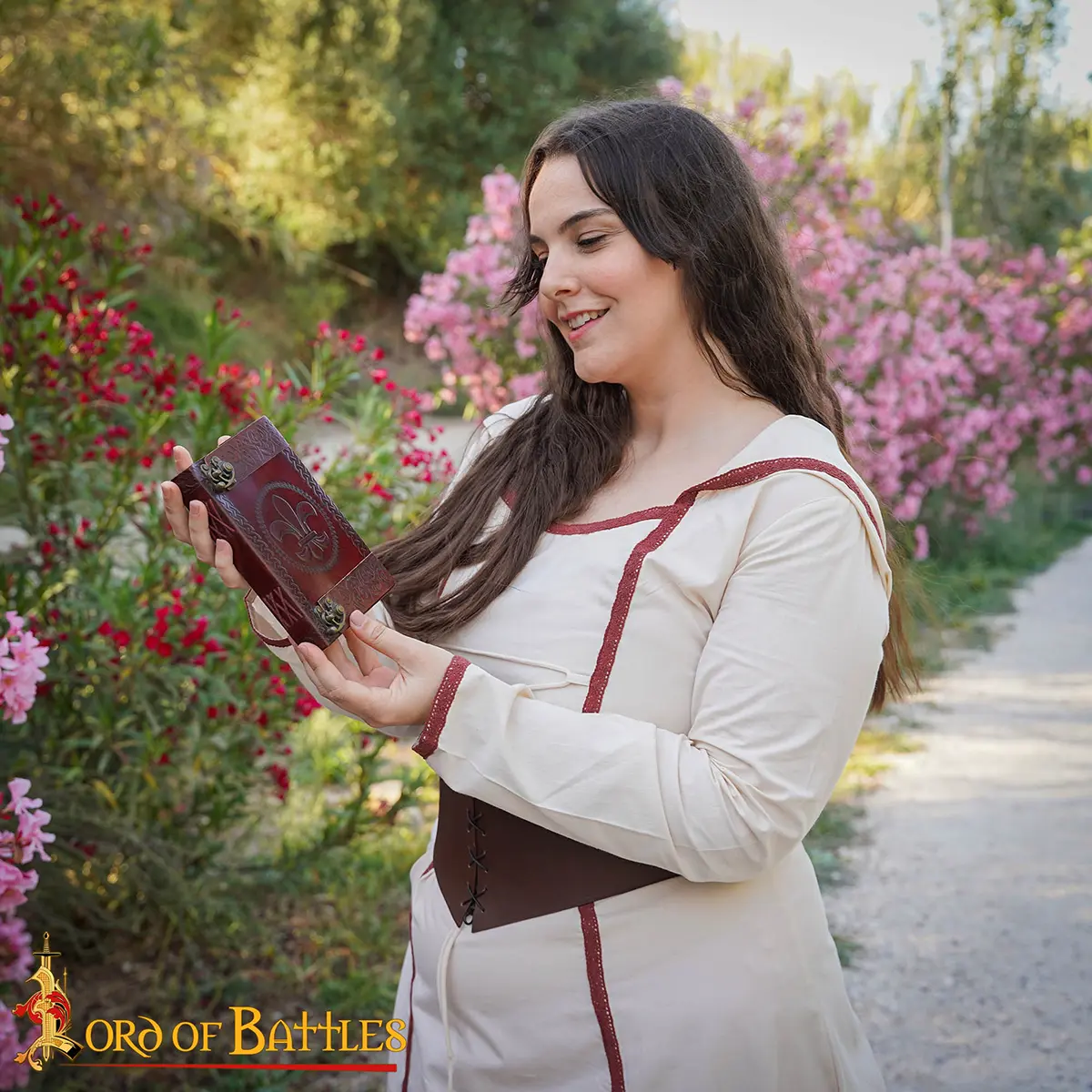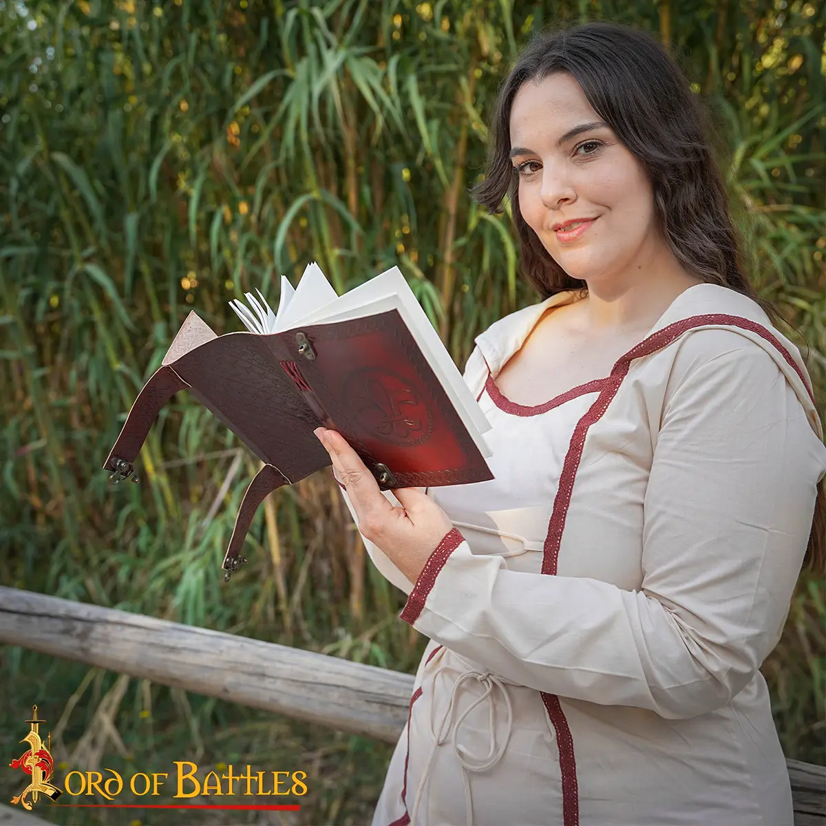 The genuine leather cover, hand-tooled with precision and bordered by intricate medieval patterns, radiates craftsmanship. Its deep, earthy tones carry the unmistakable scent of real leather, a reminder of tradition with every touch. Two antique brass lock clasps guard your words and sketches, lending both security and the unmistakable aura of an heirloom treasure. Over time, the leather will mature gracefully, developing a rich patina that makes the journal uniquely yours.
