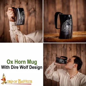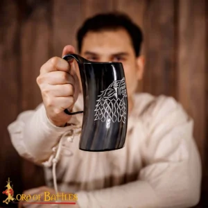 This drinking horn tankard with an engraved dire wolf design will perfectly complement your leadership and loyalty towards your clan. It is not just any drinking horn; it is our AUTHENTIC DRINKING HORN, made for your splendid Viking feasts. For you to keep it safe and protected, a sturdy cotton canvas bag comes included with this horn.