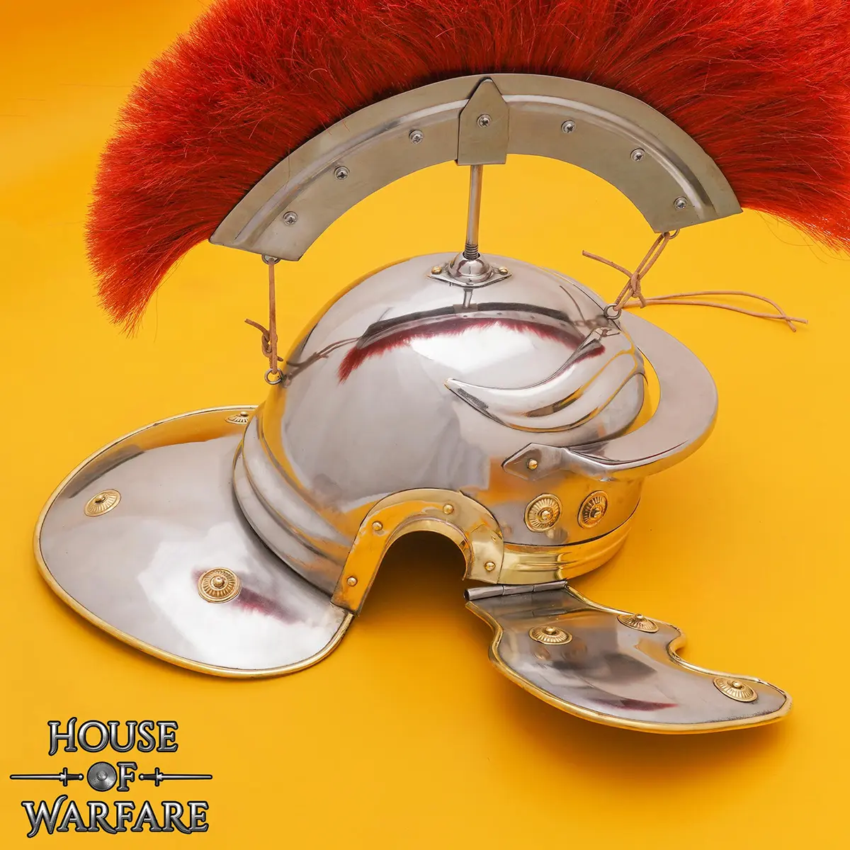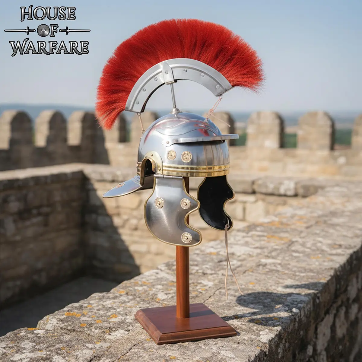 A detachable red plume crest is included, made from a blend of natural hair and durable nylon. In Roman times, crests were used to show rank, unit identity, or for display. This feature makes the helmet suitable for both display and active use.