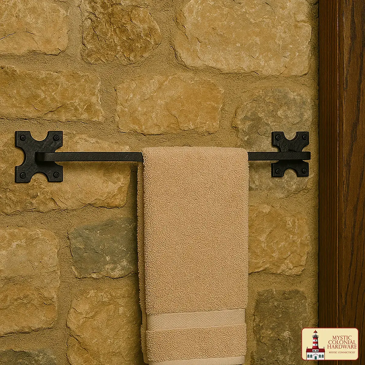 Bring heritage charm and sturdy functionality to your home with the Mystic Colonial Hardware Wrought Iron Bar. Carefully hand-forged by skilled artisans, this towel bar captures the simple elegance and rugged reliability of early American ironwork.The design features a straight iron bar anchored by decorative mounting plates, echoing the authentic shapes found in colonial and early farmhouse hardware. Its forged texture and matte black finish lend timeless appeal, making it a perfect addition to bathrooms, kitchens, or any space needing a touch of rustic sophistication.