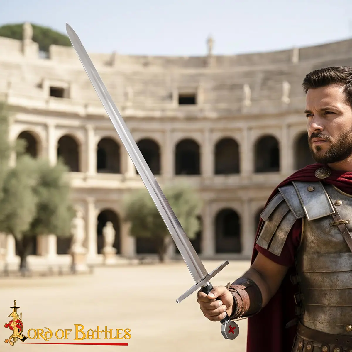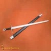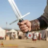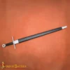 The design of this sword follows that tradition. It has a straight, double-edged blade with a simple cross guard and a distinct pommel marked with a red cross, which is an iconic symbol associated with the Order. This style was common among crusading knights and was used across Europe and the Holy Land. It has a comfortable to hold grip with wrapped leather and a long scabbard for protection and easy storing.