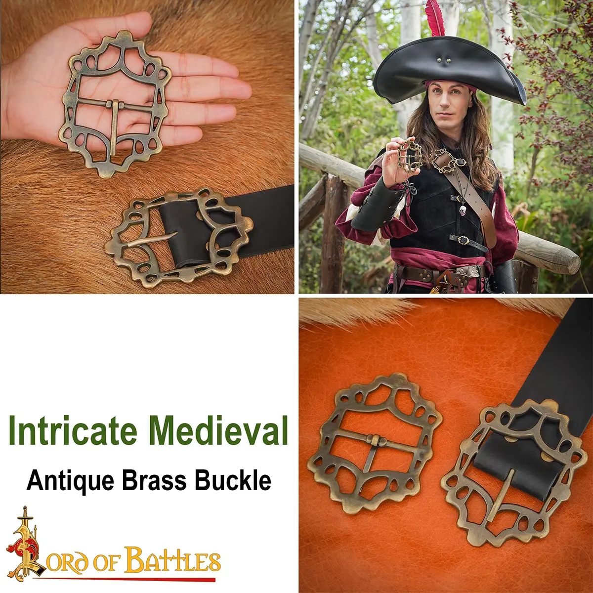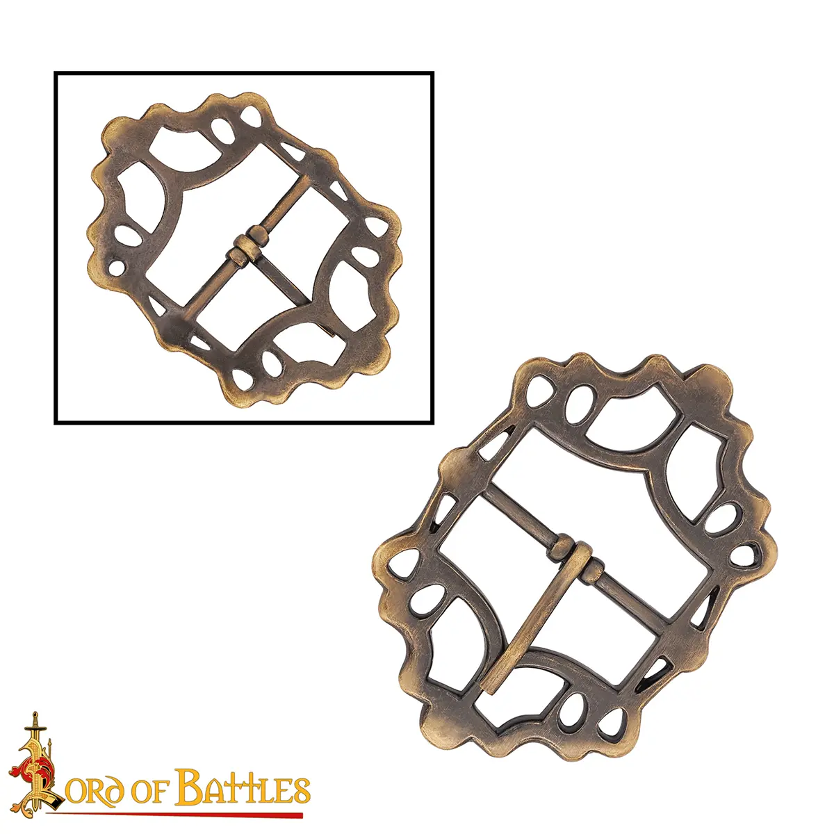This buckle features a distinctive openwork and scalloped contours, echoing the flowing Gothic and Renaissance motifs common in period artifacts. The solid brass construction provides lasting strength, while the antique finish provides an authentic timeworn look that rivals museum-quality reproductions. Unlike many modern replicas, the buckle is both decorative and fully functional, allowing you to secure belts, pouches, sword frogs or costume elements with confidence.