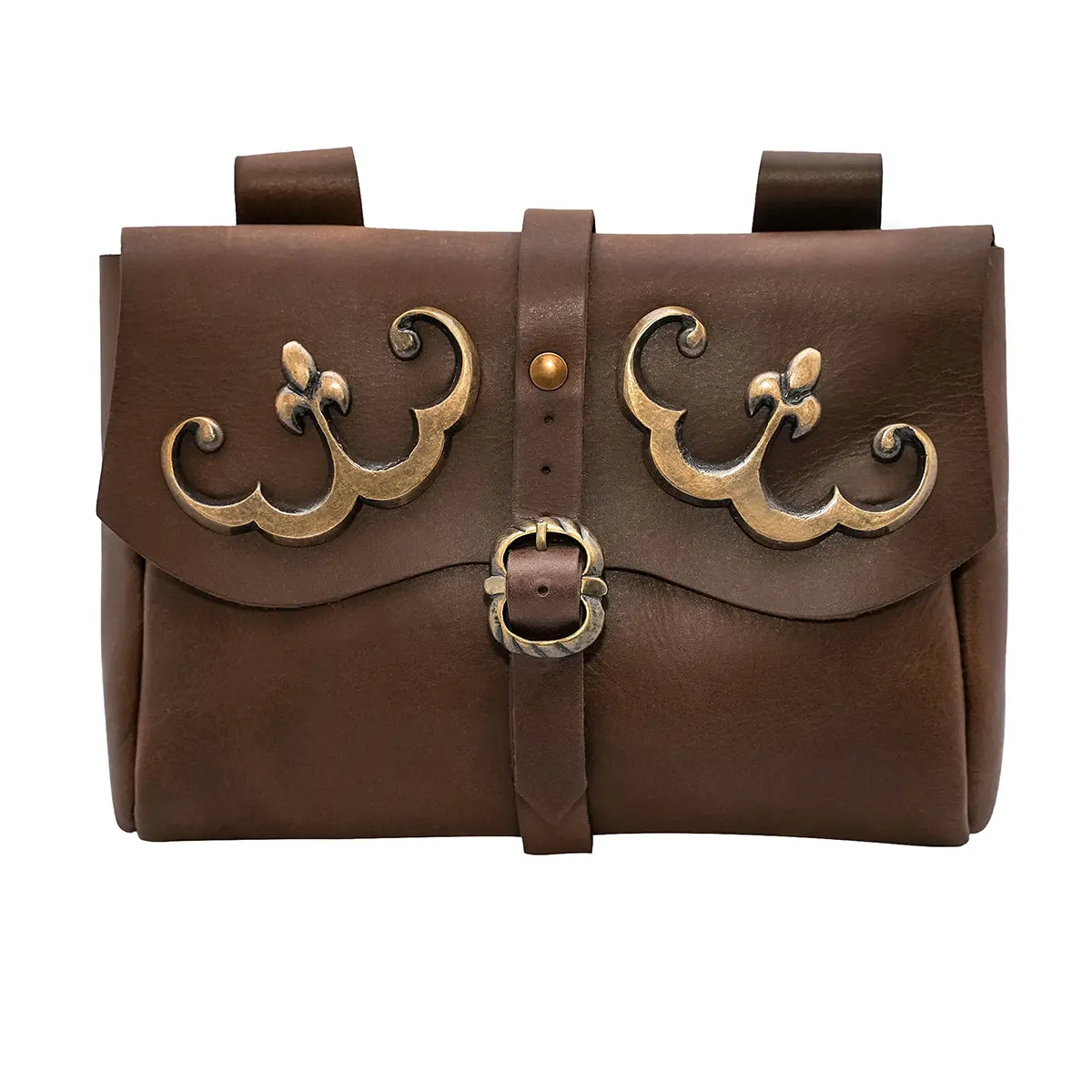 Designed for style and practical use, it has belt loops at the back so you can easily attach it to your belt and carry your essentials without any hassle. The front flap is adorned with two antique-finish brass accents that add a touch of old-world charm. The tip of the brass adornments has the famous fleur de lis design , associated with decoration, art and architecture.