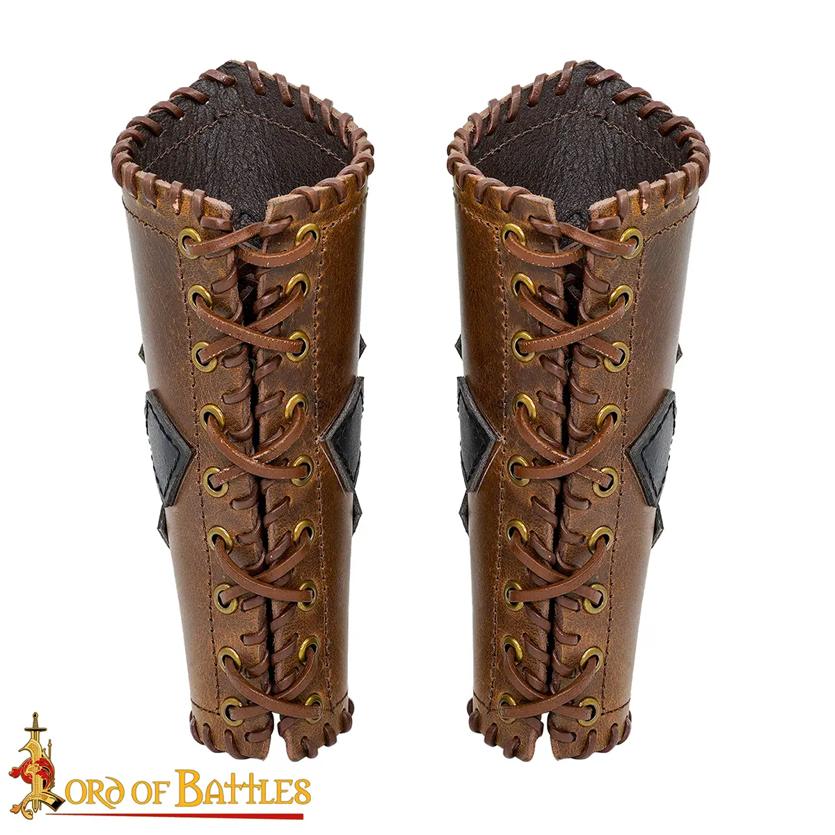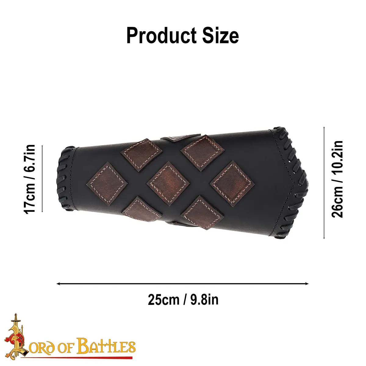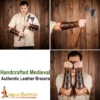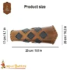Meticulously handcrafted from genuine BUFF LEATHER, these are robust and offer longevity. They measure approx. 25 cm in length. The width from the wider end is approx. 26 cm and that from the narrower end is approx. 17 cm. For a better fit, these bracers come with adjustable REAL leather cords.