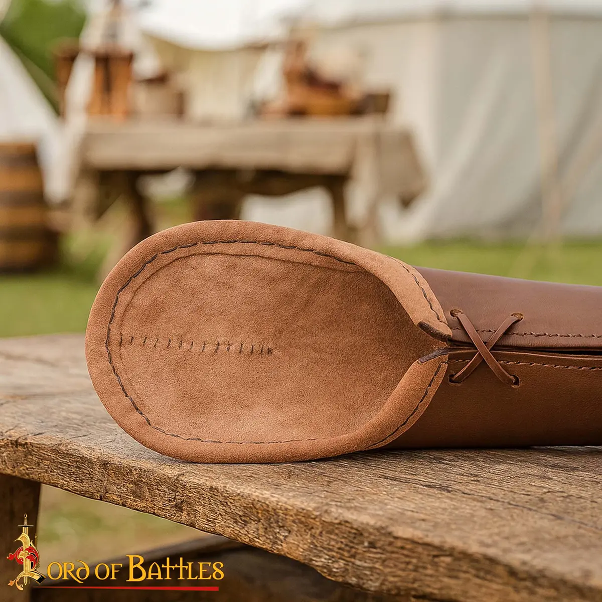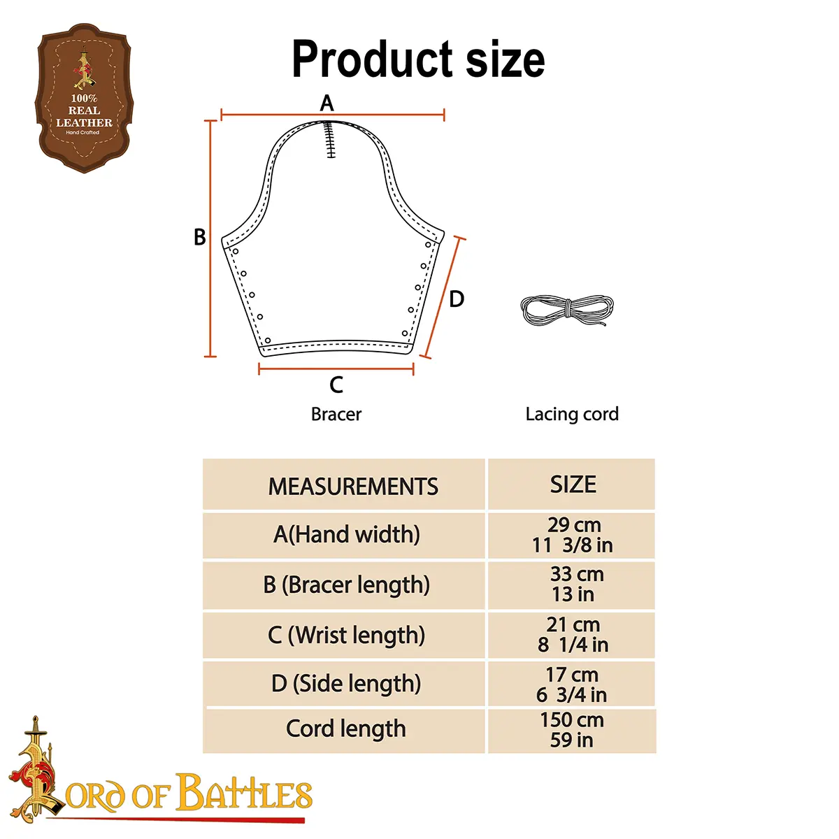At the back, cross-laced leather cords run through reinforced metal eyelets, allowing the bracers to be tightened or loosened for a perfect fit. This system makes them versatile enough to be worn over a gambeson sleeve, padded clothing, or directly on the arm. The lacing also adds a bold, historically inspired look true to medieval craftsmanship.